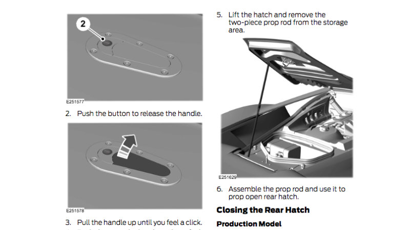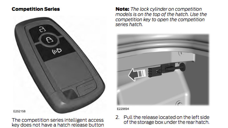 On Page 42, the manual makes mention of a Competition Series model that uses a different key fob lacking a remote rear hatch release, stipulating that the hatch must be opened manually. Rather an being locked electronically, the hatch of the Ford GT Competition Series will be latched with racing-style hood-pins.