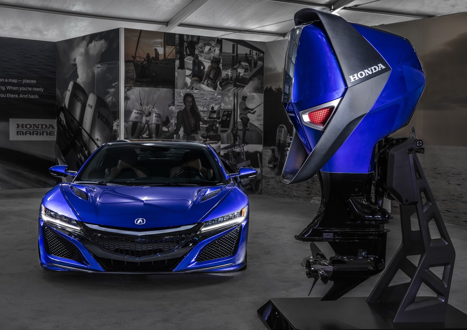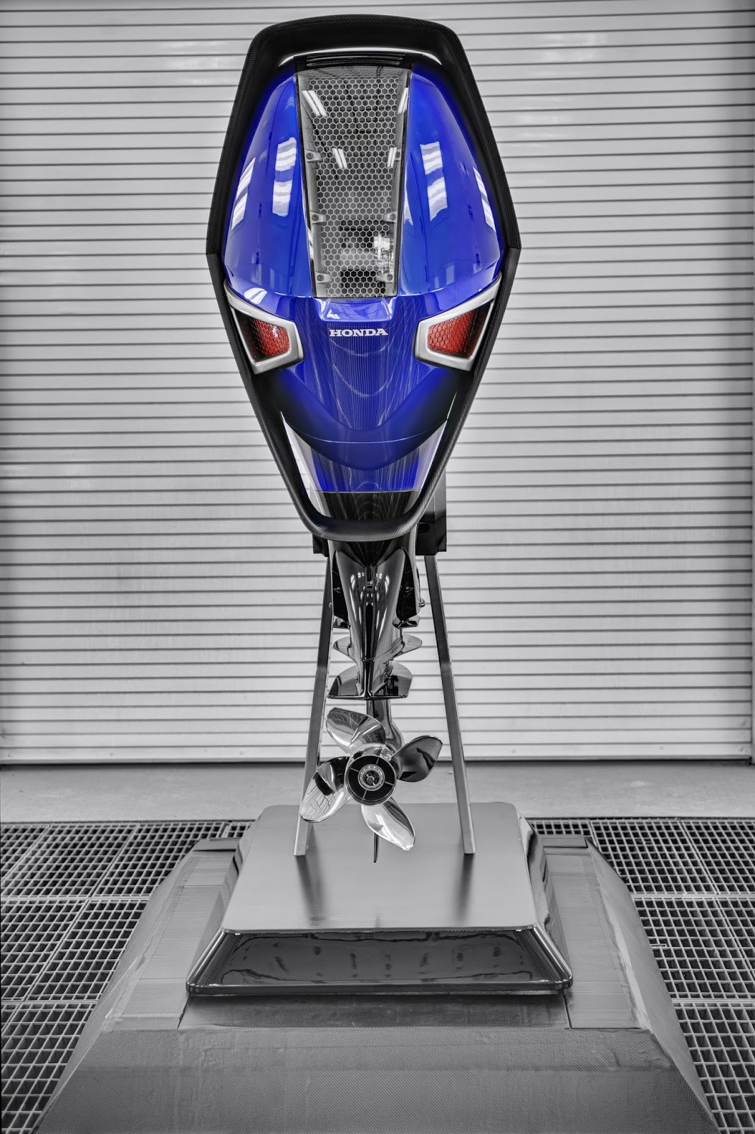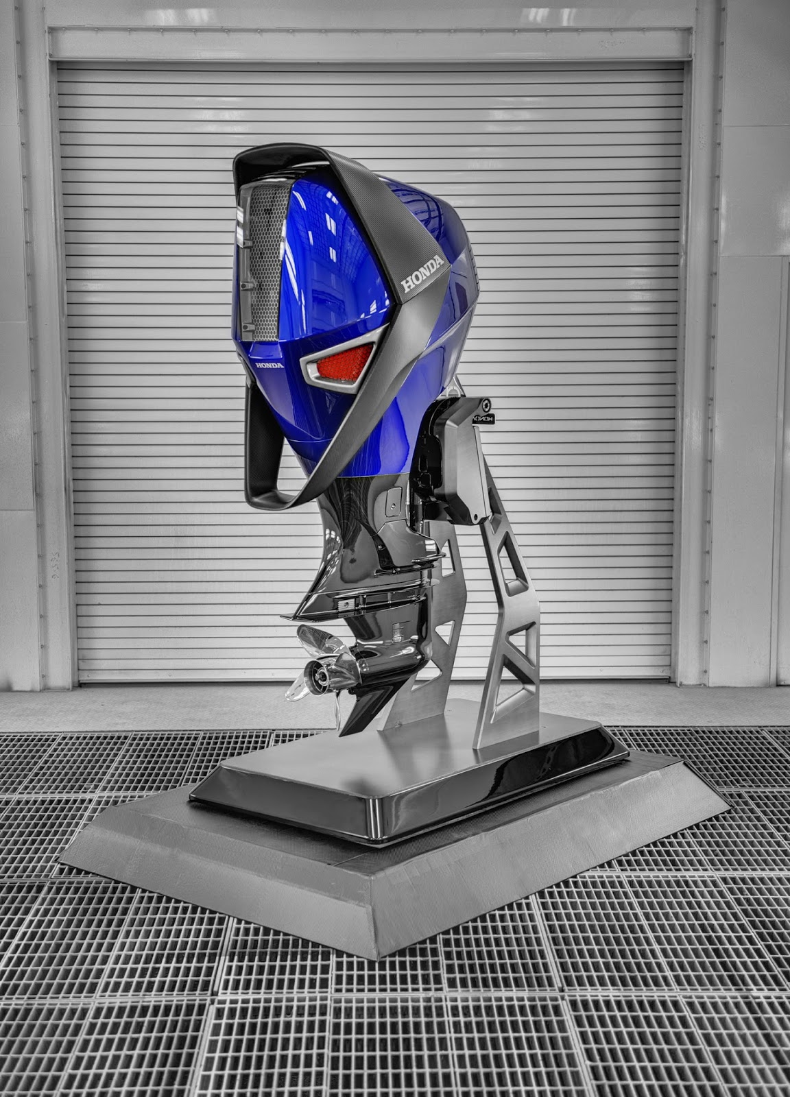 NSX references on the taller than usual outboard include the heat ducts with an interwoven design with black honeycomb mesh, a floating winged blade and the Nouvelle Blue Pearl color – though Honda pointed out that it could be painted in any shade.