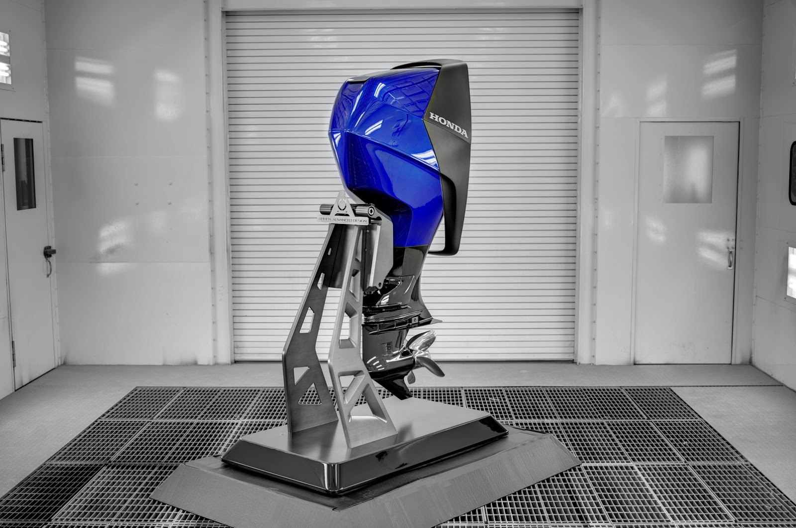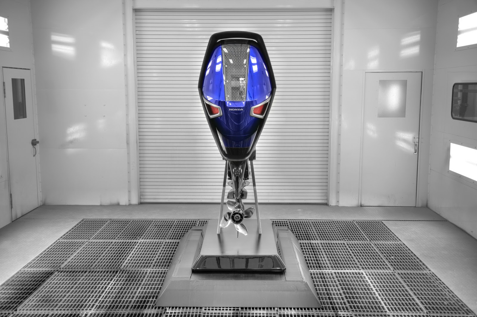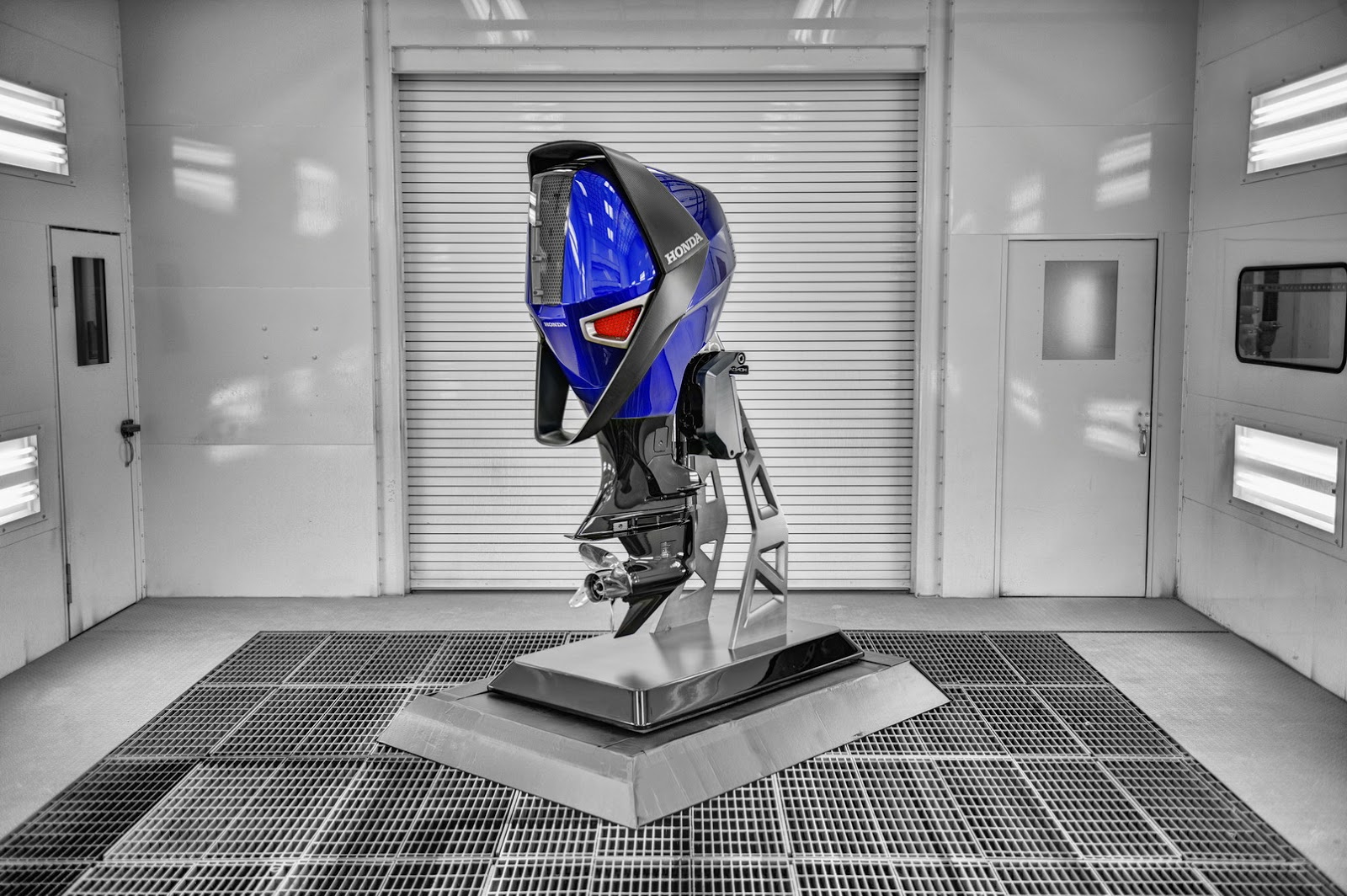 NSX references on the taller than usual outboard include the heat ducts with an interwoven design with black honeycomb mesh, a floating winged blade and the Nouvelle Blue Pearl color – though Honda pointed out that it could be painted in any shade.