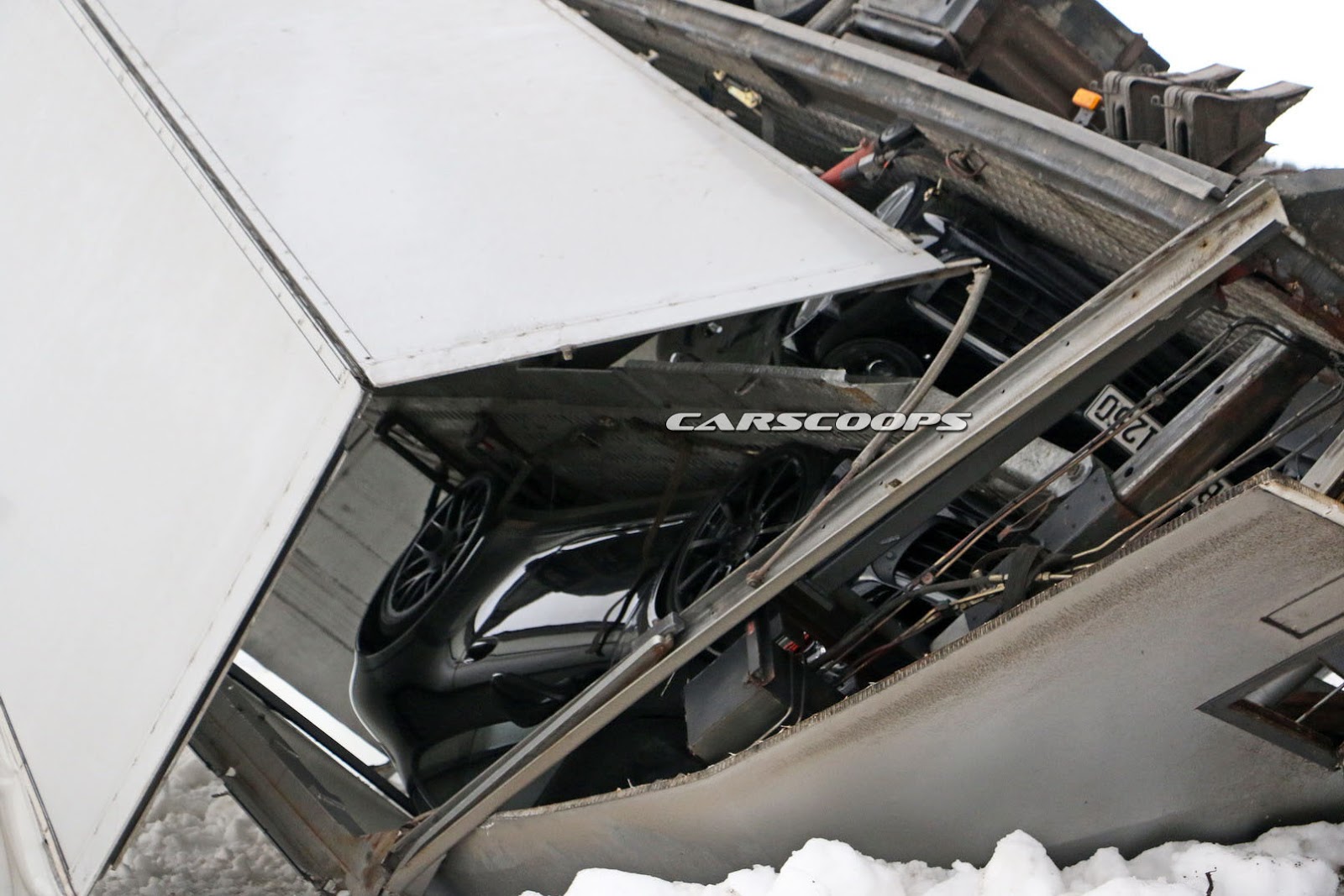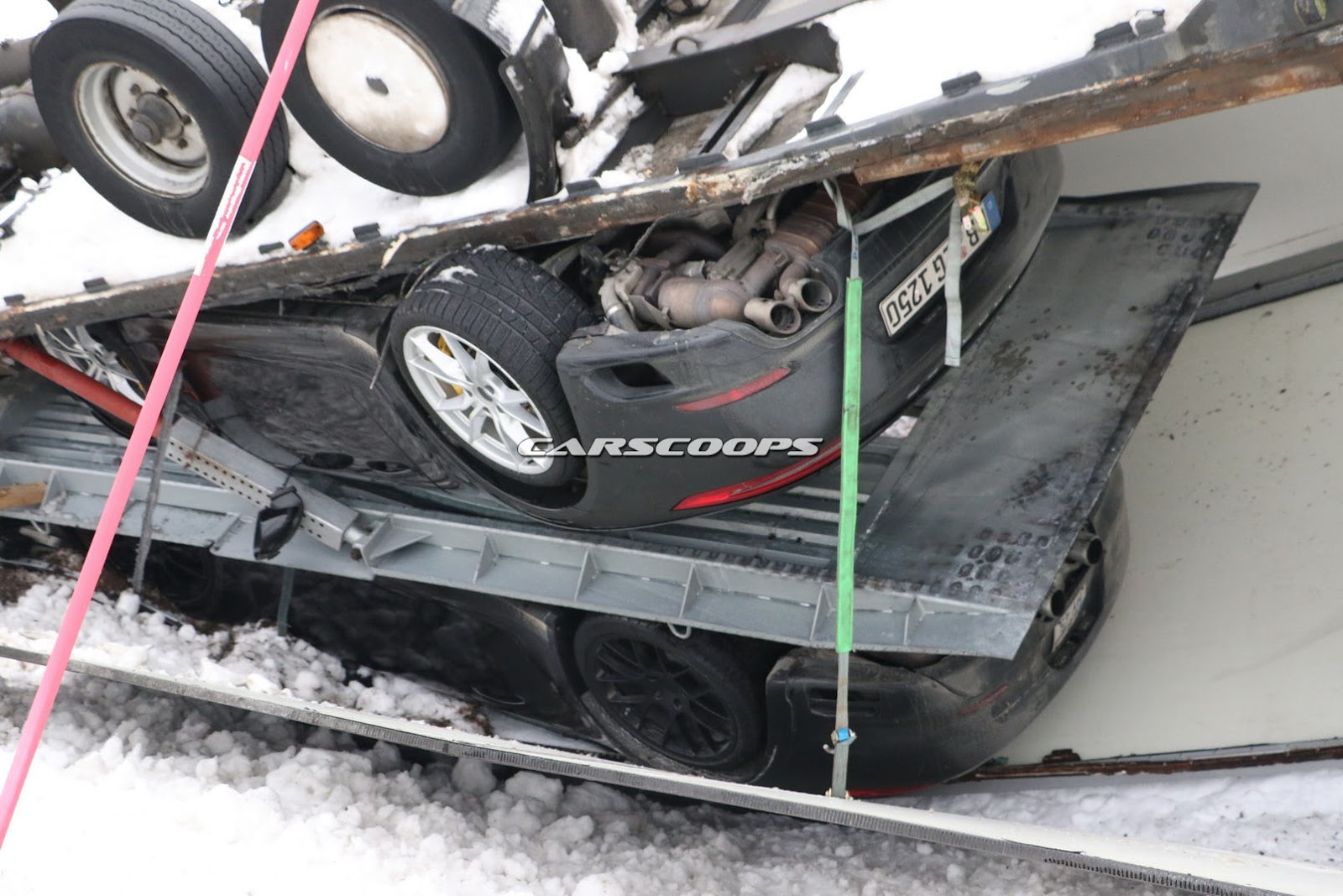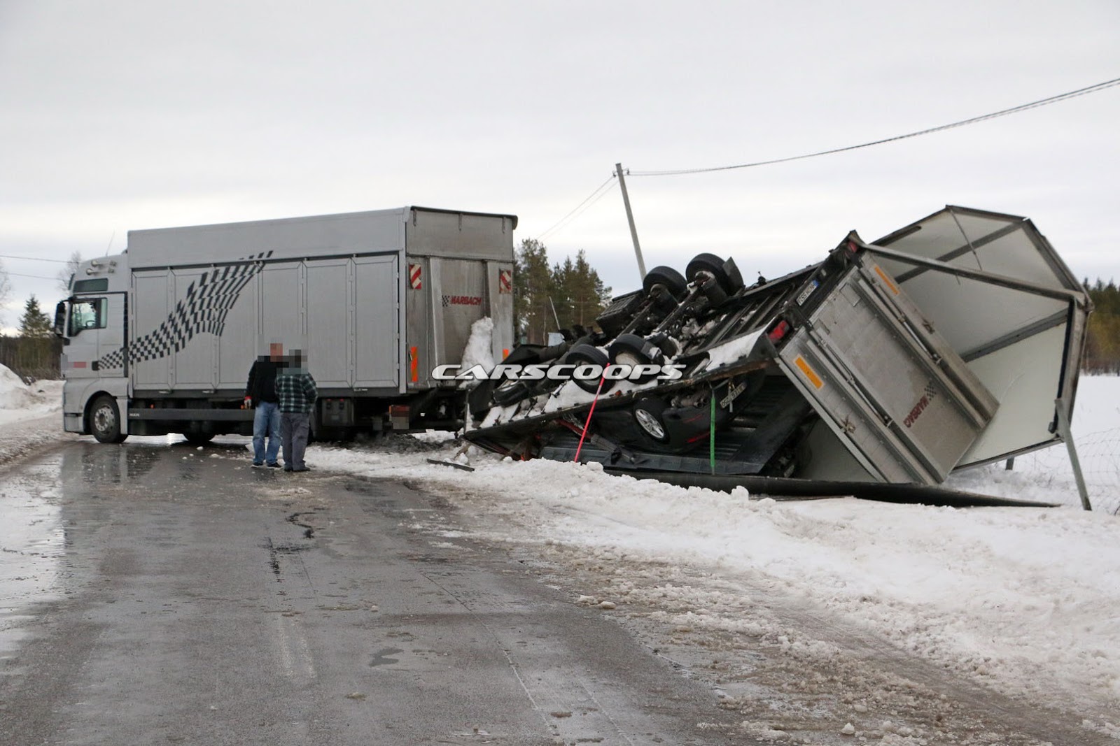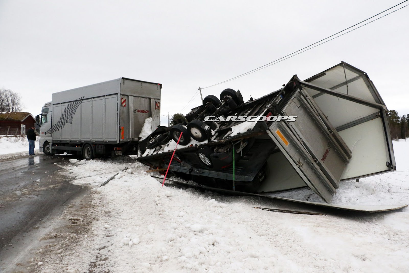 According to the photographer at the scene, “the trailer got caught by the wind and blew off to the ditch where it then crashed lying upside down. Inside there where 2 Porsche test cars, one of them a mule for the new Porsche 911 (992). Both cars are probably totaled but the most important thing is that nobody got hurt.”