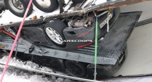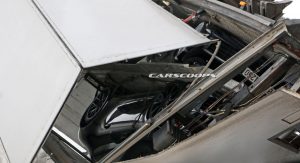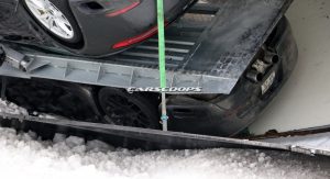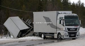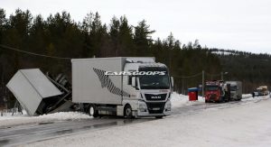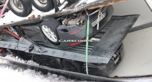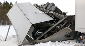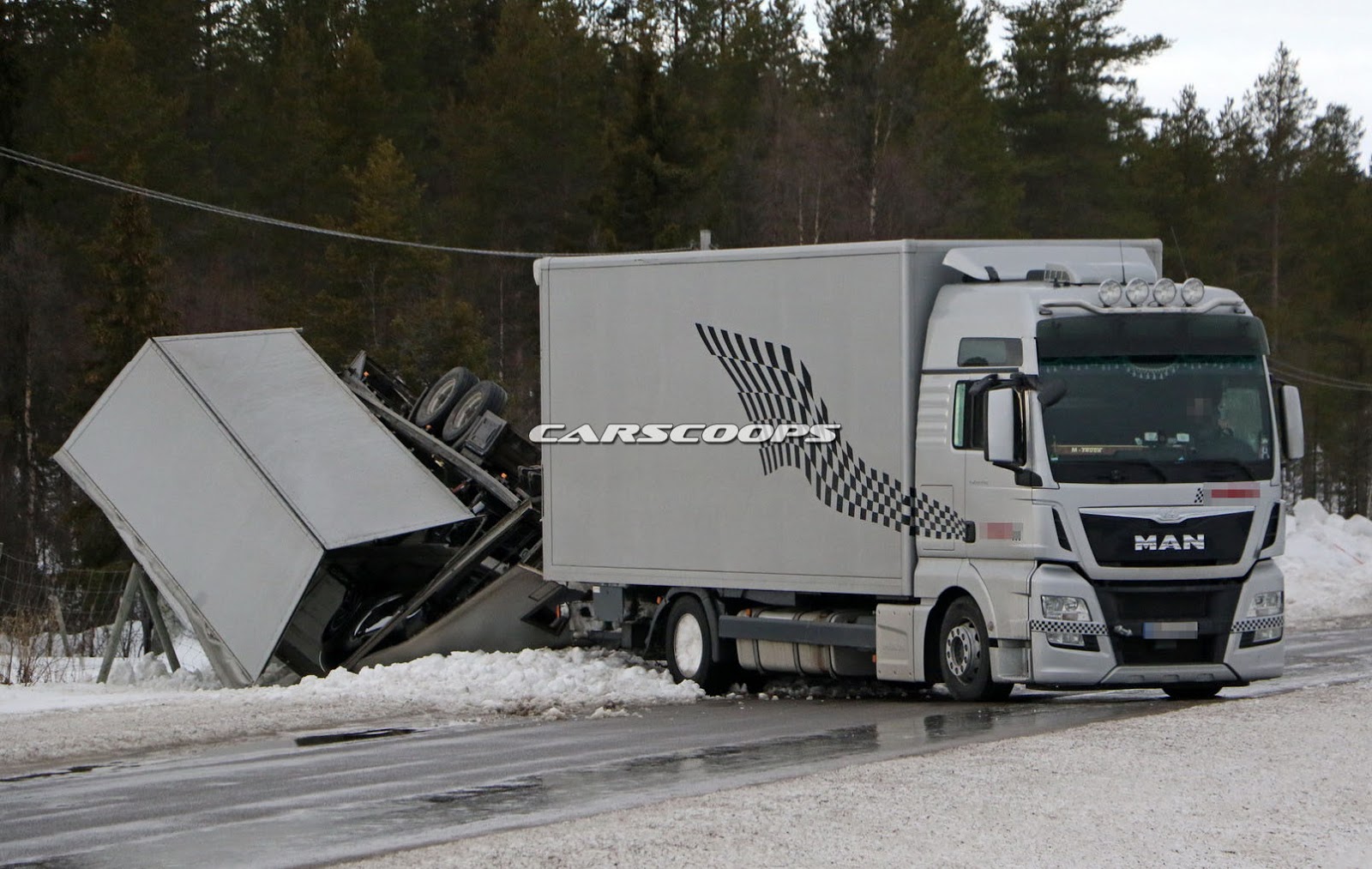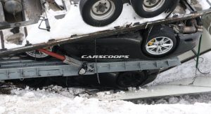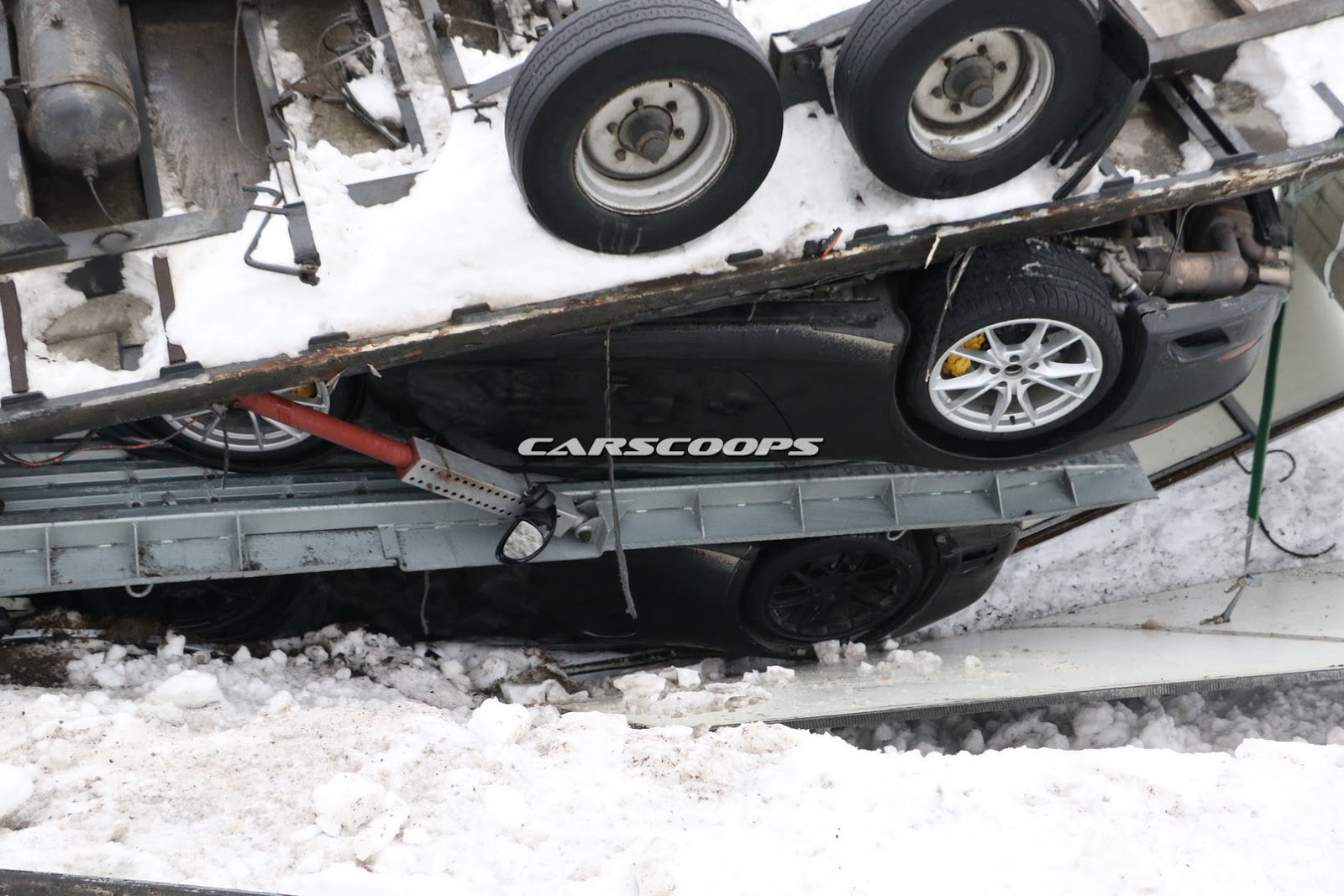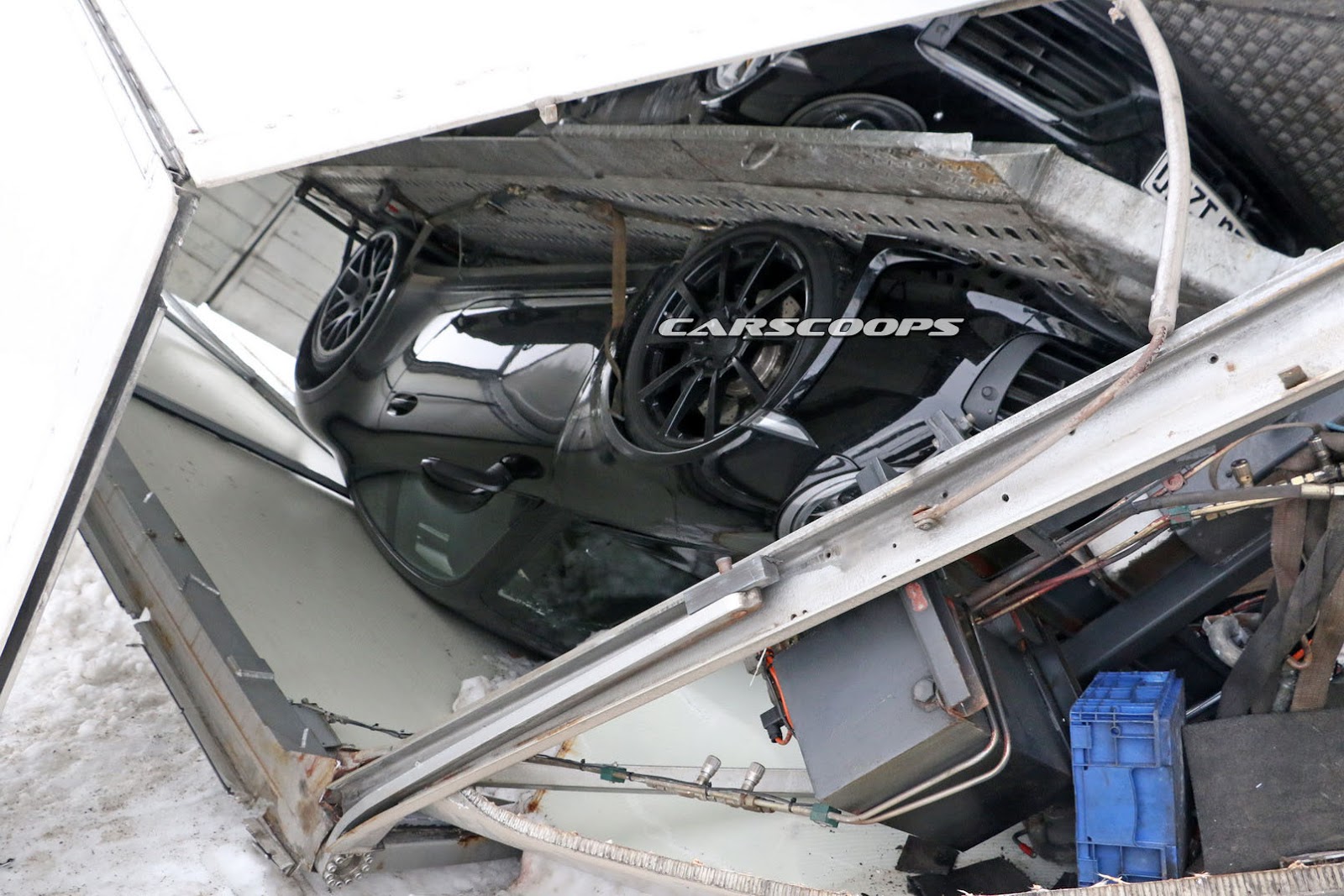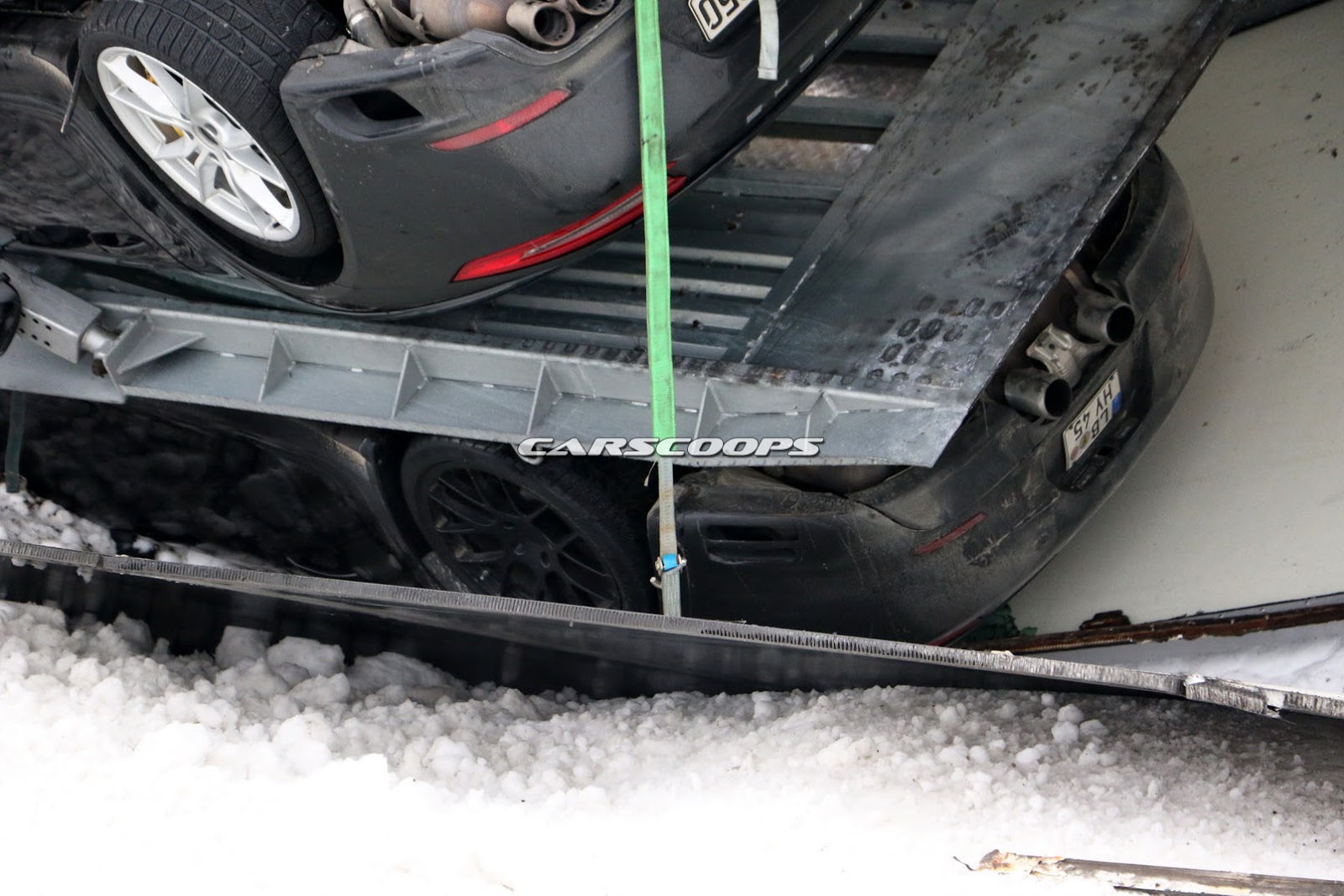 According to the photographer at the scene, “the trailer got caught by the wind and blew off to the ditch where it then crashed lying upside down. Inside there where 2 Porsche test cars, one of them a mule for the new Porsche 911 (992). Both cars are probably totaled but the most important thing is that nobody got hurt.”