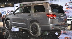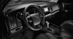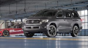 Most of the key features on the TRD Sport Tundra also translate to the TRD-tuned Sequoia, which has the same engine, custom shocks, anti-sway bars and 4×4/4×2 modes as its pickup truck sibling. Exterior features specific to the Sequoia TRD Sport include a new front grille and bumper grille insert, metallic black mirror caps, 20″ alloy black sport wheels, darkened rear taillight housing, a black satin finish TRD Sport badge on the front doors and a metallic black and chrome Sequoia badge on the liftgate.