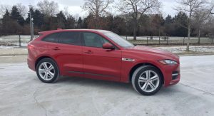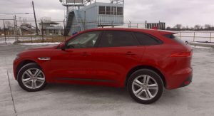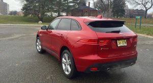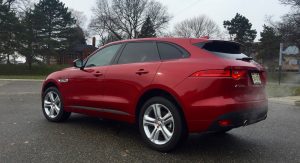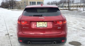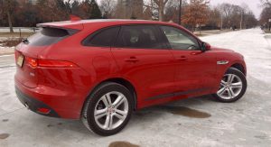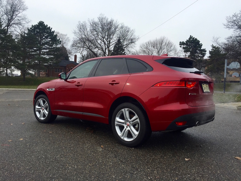 Looking straight at it, the front is a little plain, but the rest of the F-Pace is well-sculpted, with careful creases and a generally attractive shape that’s carried from front to rear. Some SUVs suffer from sharp fronts that collapse into nondescript rears, but this one escapes that for the most part. Perhaps it’s the Italian Racing Red paint (a peculiar name for a Jaguar color, but OK) that makes the F-Pace look extra rakish. Also helping matters are attractive 20-inch wheels on this R-Sport model. I’ll get to why those hurt in other places later.