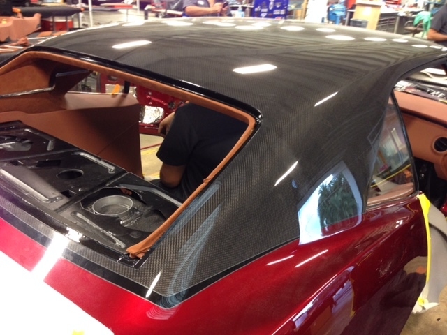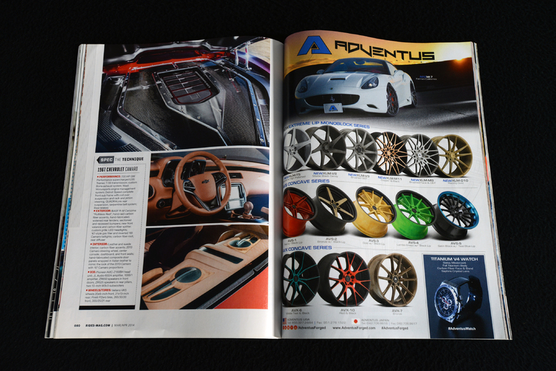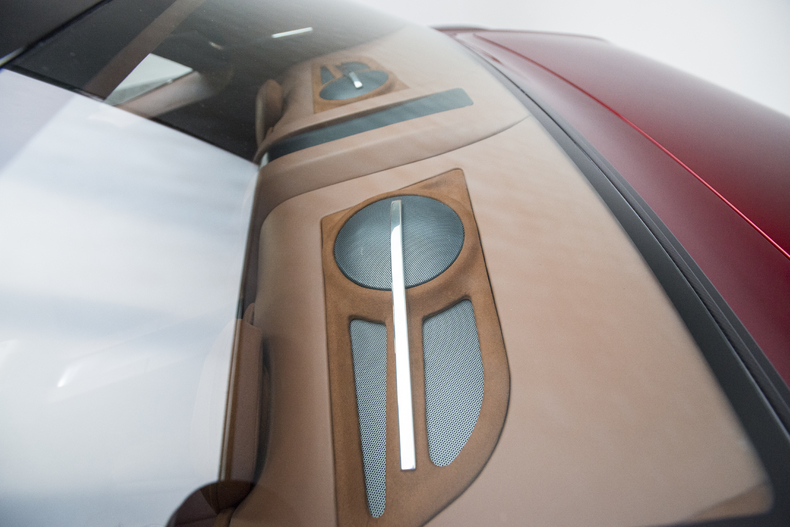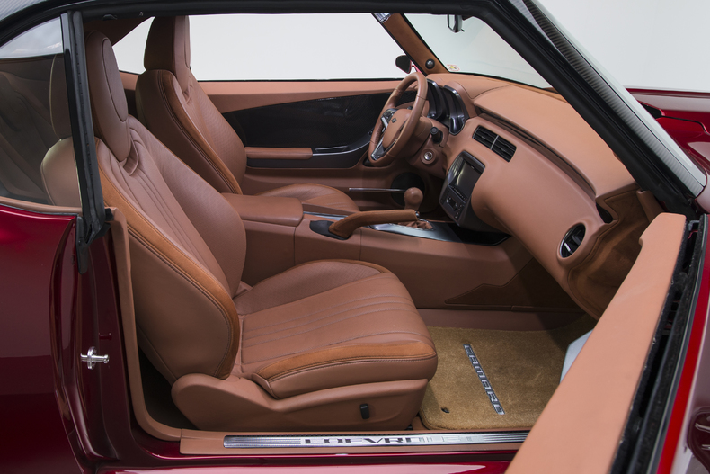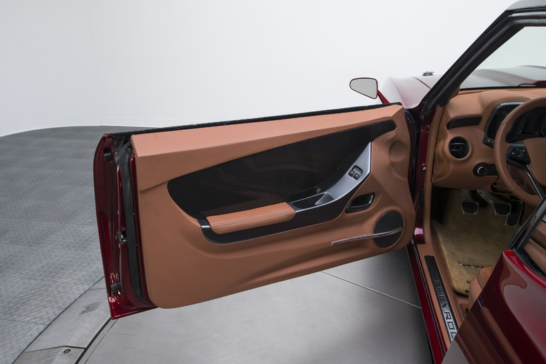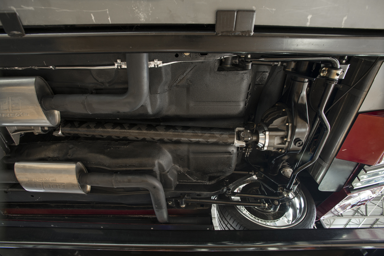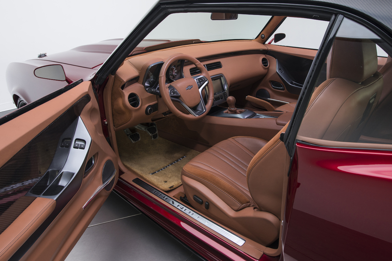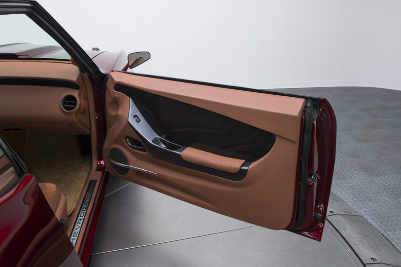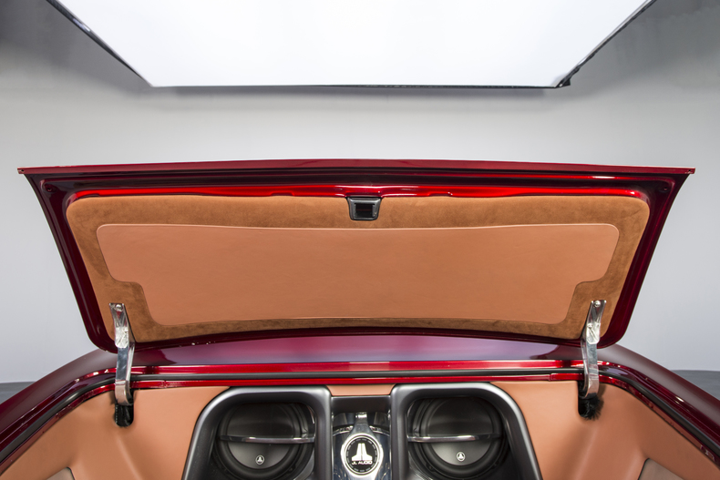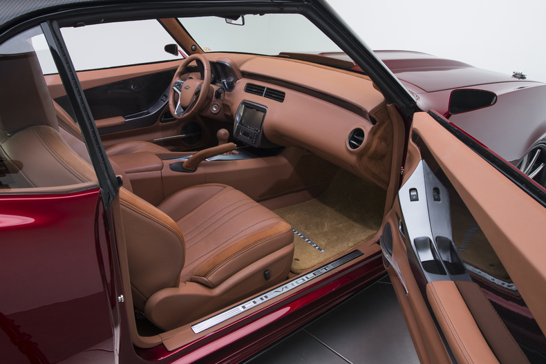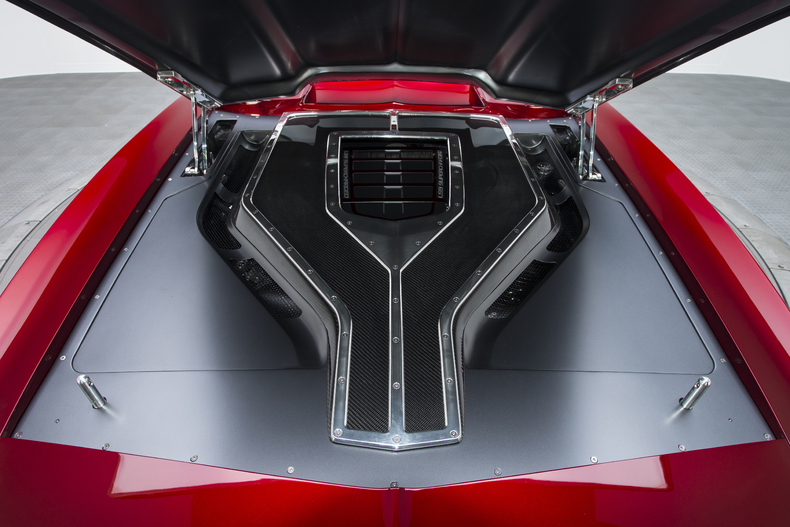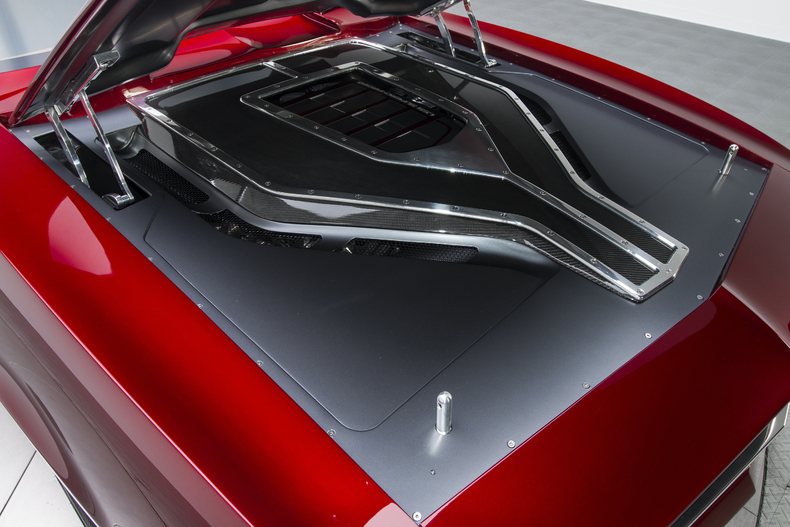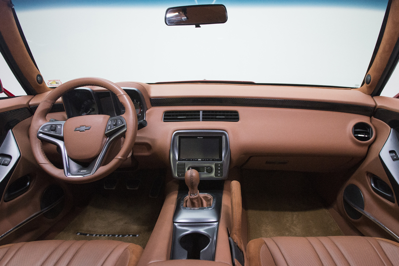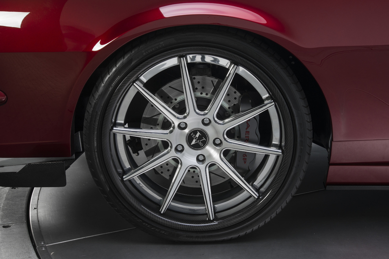 Other external features include the BASF Carizzma Ruthless red paint, hand-laid carbon fiber roof, custom 20 & 21″ Vellano VKS wheels, custom hood & trunk lid, ’69 Camaro taillights, Baer 4-wheel disc brakes and the custom side-exit exhaust.
