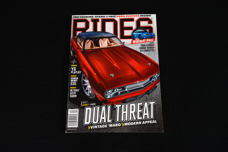 Inside, the builder brought the 1967 Camaro’s interior into the 21st century by adapting a 5th-gen Camaro cabin, which was further customized in leather and suede, featuring air conditioning, a Pioneer touchscreen system, JL subwoofers, F5 buckets, custom rear buckets, carbon fiber trim and custom pillar covers.