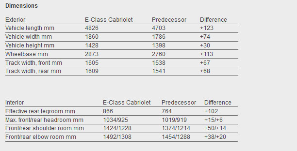 An increase in exterior dimensions (123mm / 4.8 in. longer, 74mm / 2.9 in. wider) together with a 113mm / 4.5 in. longer wheelbase than the previous E-Class Convertible, give the new model a boost in space, with rear passengers gaining an additional 102mm (4.0 in.) of legroom.