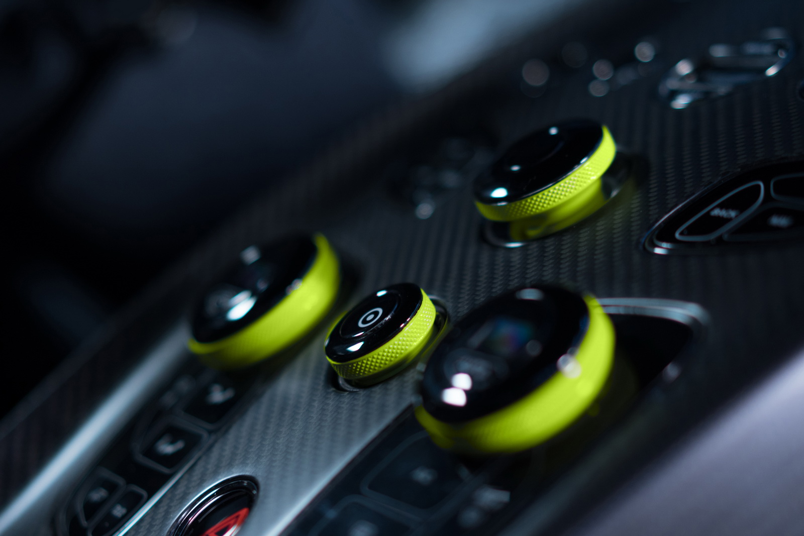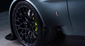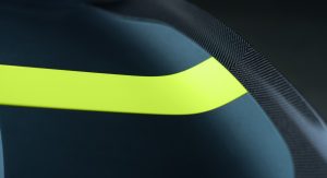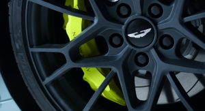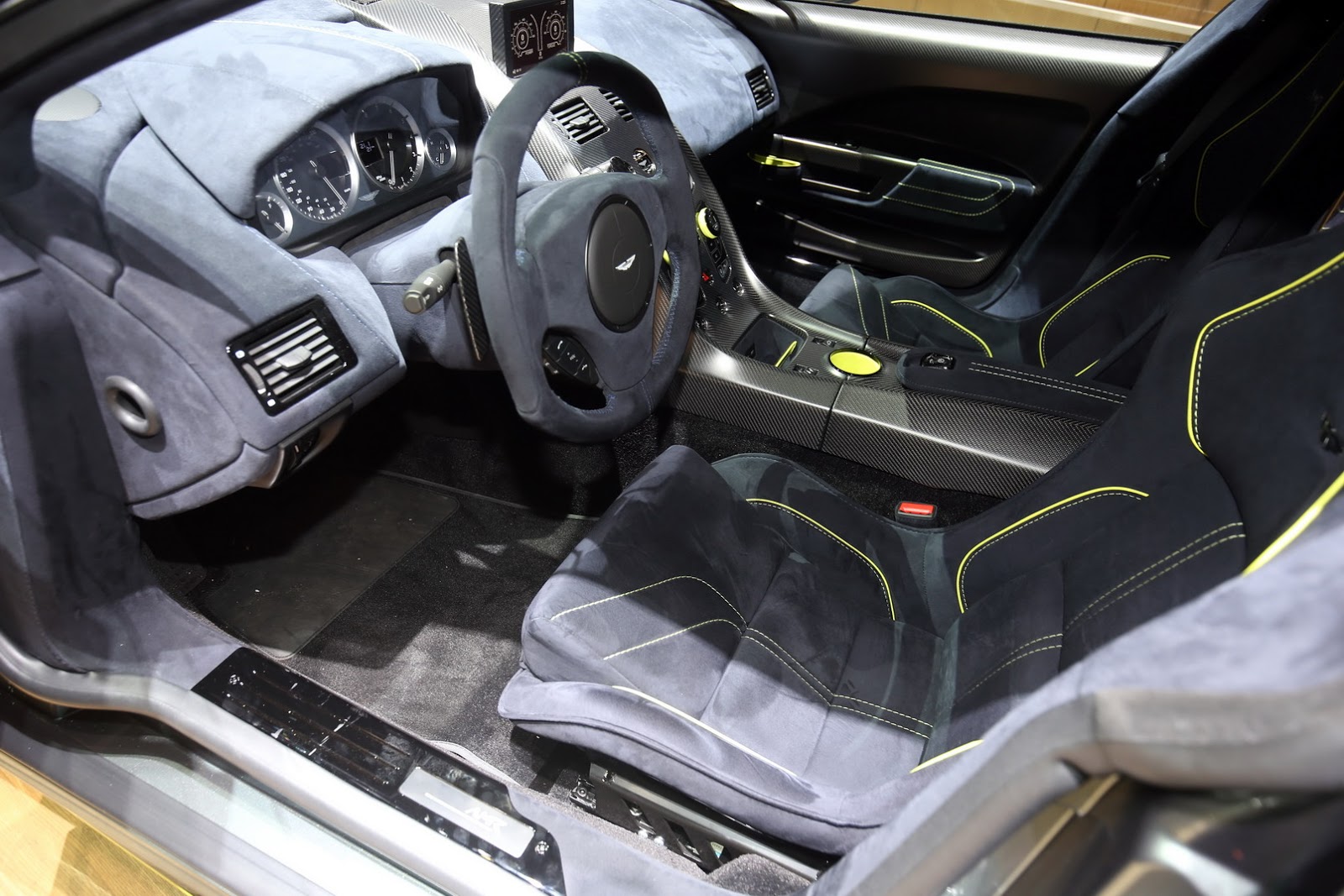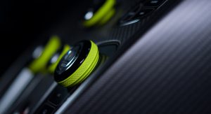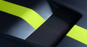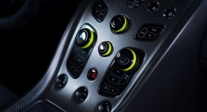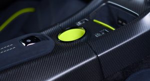 The cabin now features a pair of lightweight carbon fibre seats at the front, dressed in what Aston Martin calls “Dark Knight Alcantara” with lime green accents while the center console and door casings now feature carbon fiber.