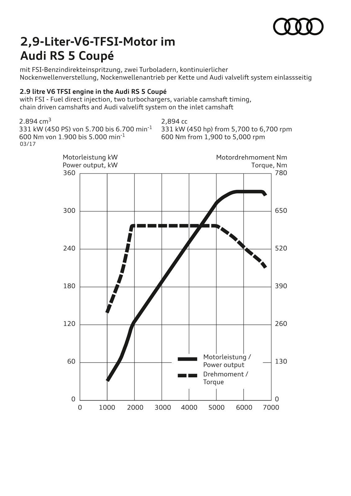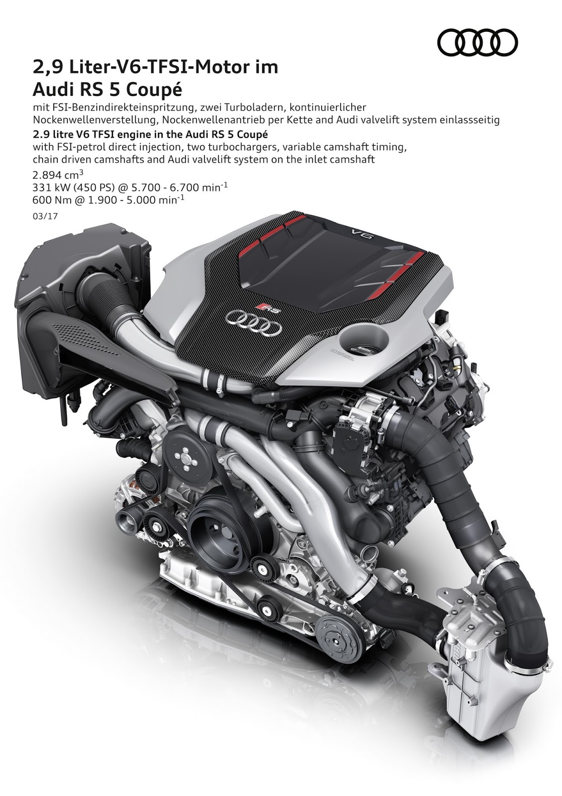 As Audi’s first Audi Sport model in the new RS design idiom, the new RS5 features a newly developed bi-turbo V6 unit good for 450 PS (443 HP) and 600 Nm (443 lb-ft) of torque.