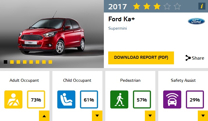 Three stars were scored by the newly launched Ford Ka+, which showed poor protection for the rear passenger in the full-width frontal crash test, and lacking features such as autonomous braking and rear seatbelt pretensioners sealed its fate in the safety assist.