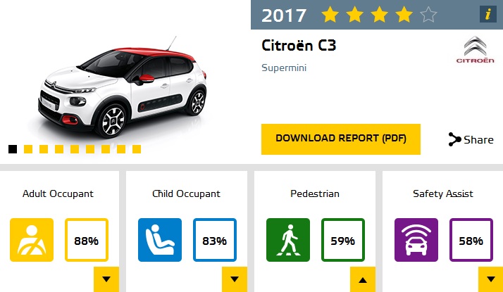 Tested during the same session by the European safety specialists, the new generation Citroen C3 narrowly missed a top five-star rating, and scored 4 stars. The French supermini didn’t fall short in the adult or child occupant, but in the pedestrian protection, where parts of the windshield were noted as being poor.