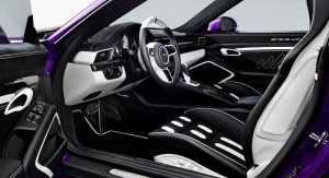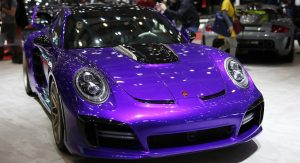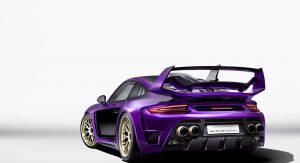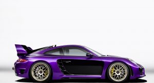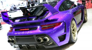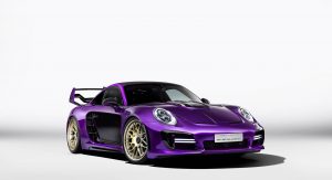 Decked out in purple, the Gemballa Avalance wears new wide bodywork made entirely out of carbon fiber, broadening the Turbo’s track by nearly two and a half inches at the front and four inches at the rear to house 21-inch wheels.