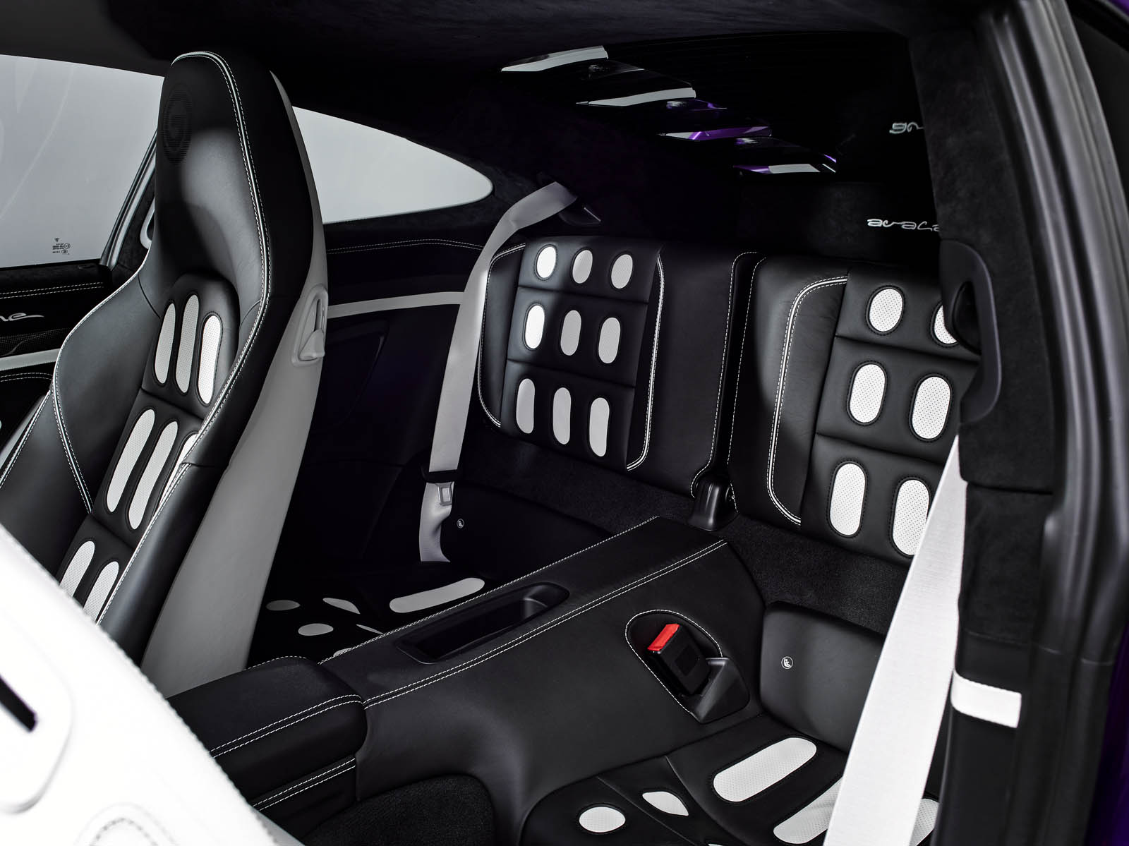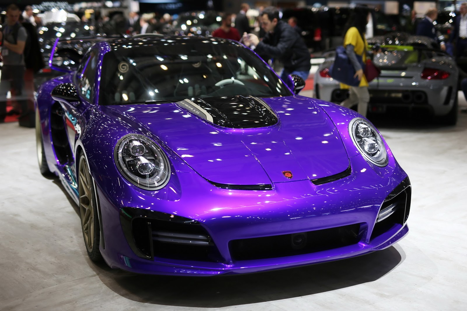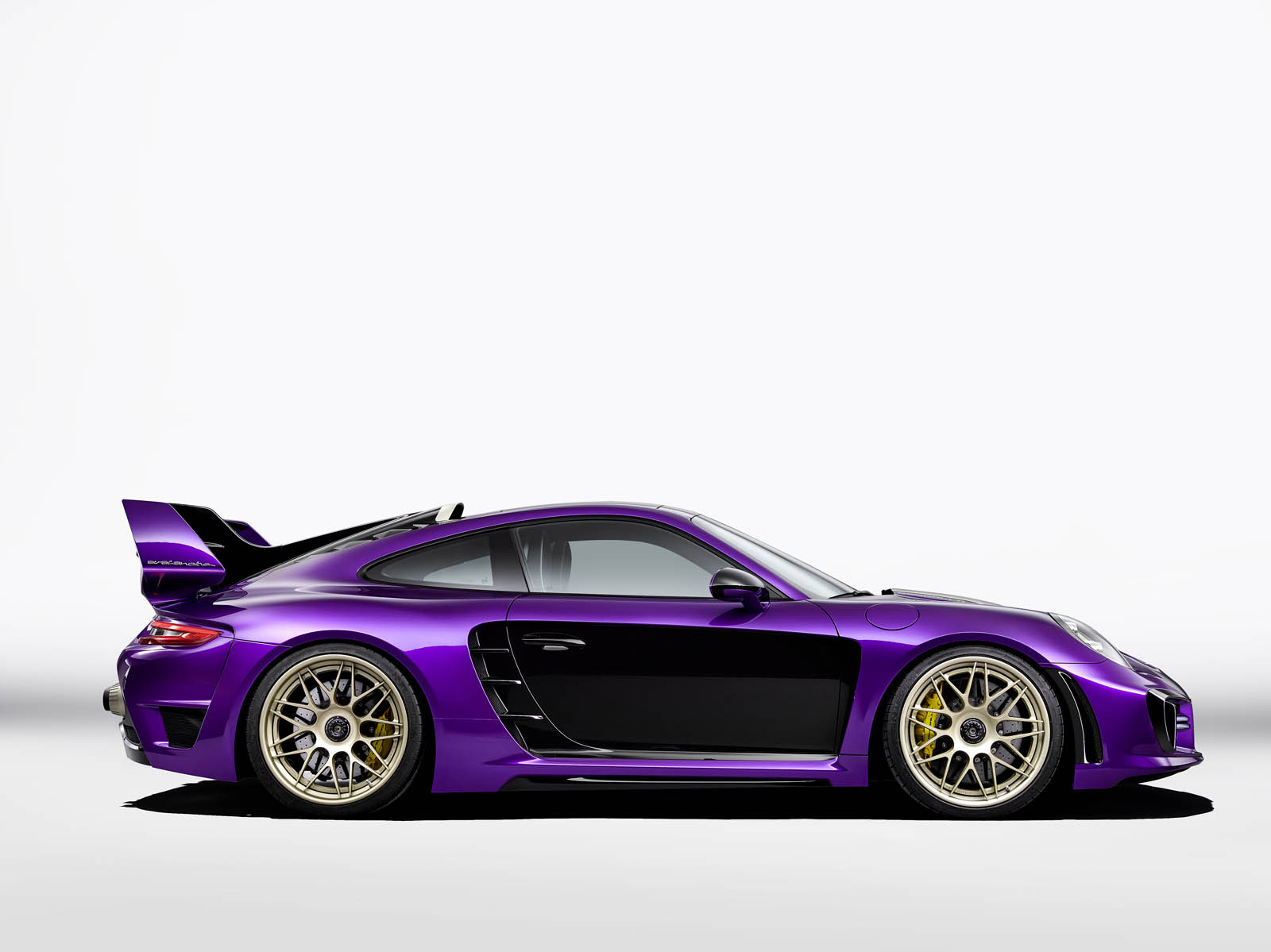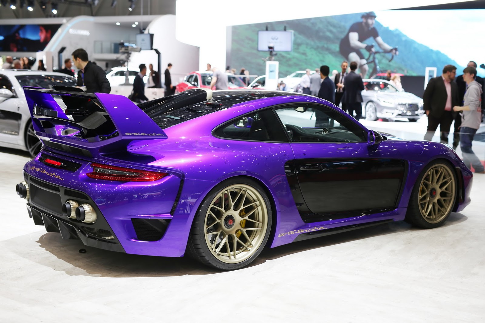 Decked out in purple, the Gemballa Avalance wears new wide bodywork made entirely out of carbon fiber, broadening the Turbo’s track by nearly two and a half inches at the front and four inches at the rear to house 21-inch wheels.