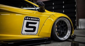 This car has already turned plenty of heads in Geneva this year, mostly thanks to its unique Liberty Walk body style and special livery. It’s got a new front bumper, side diffuser, rear bumper, massive elevated rear wing, and of course wide fenders.