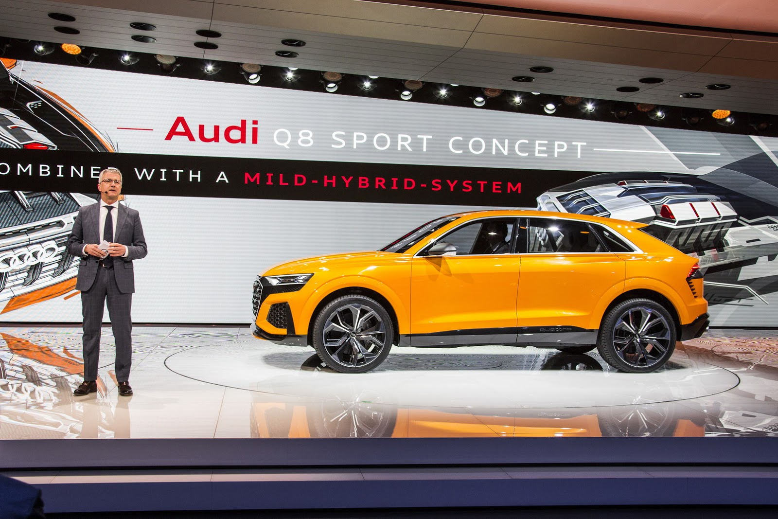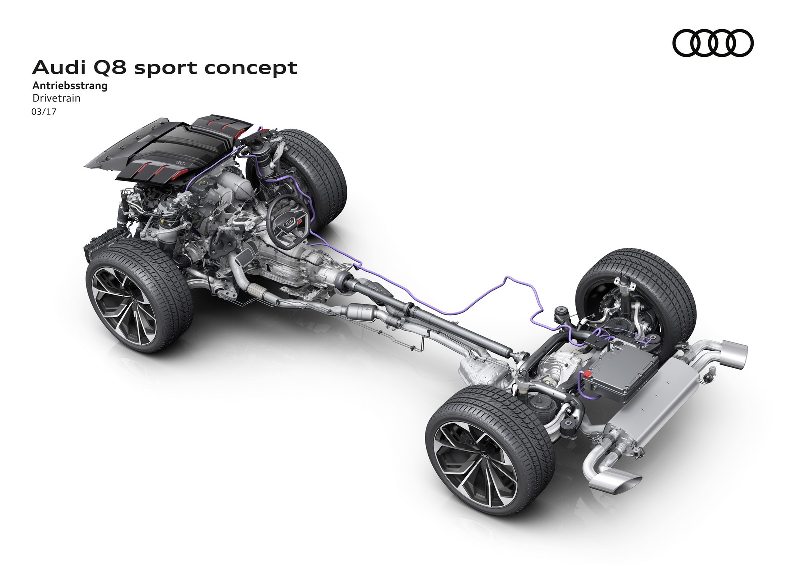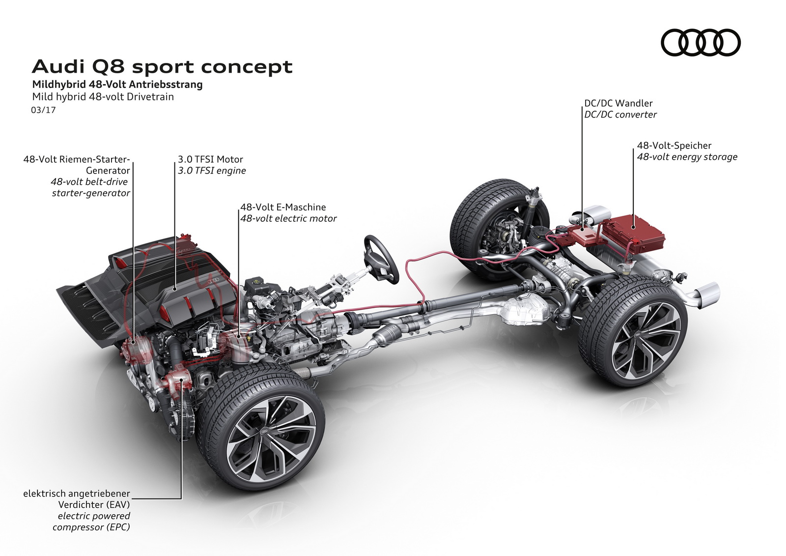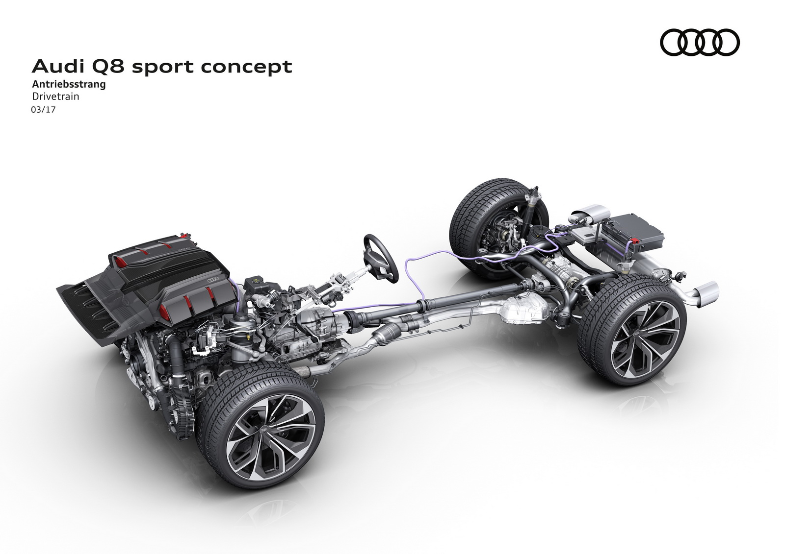 “The drive system of the Audi Q8 sport concept is a major step towards optimizing efficiency and sustainability in large-volume series production,” said Rupert Stadler, Chairman of the Board of Management at Audi. “The combination of mild hybrid technology and a TFSI engine sets a new benchmark for the synthesis of electromobility and combustion engines.”