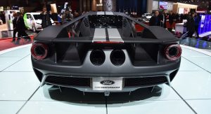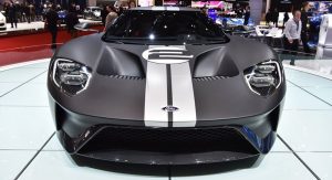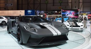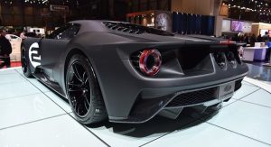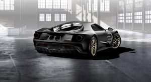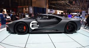 This car right here was built in honor of the classic GT40 Mark II driven by Bruce McLaren and Chris Amon during the 1966 Le Mans race over 50 years ago. Visually, what separates it from its regular-production sibling is the Shadow Black exterior finish, for starters. You can get it in both gloss or matte, with the latter being on display in Geneva.