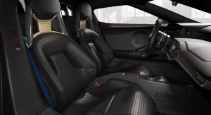 As for the cabin, it’s got even more #2 graphics (on the doors), exposed matte carbon here and there, Ebony leather-wrapped carbon fiber seats, pillars and headliner, unique blue webbing seat belts and gold appliqués on the instrument panel.