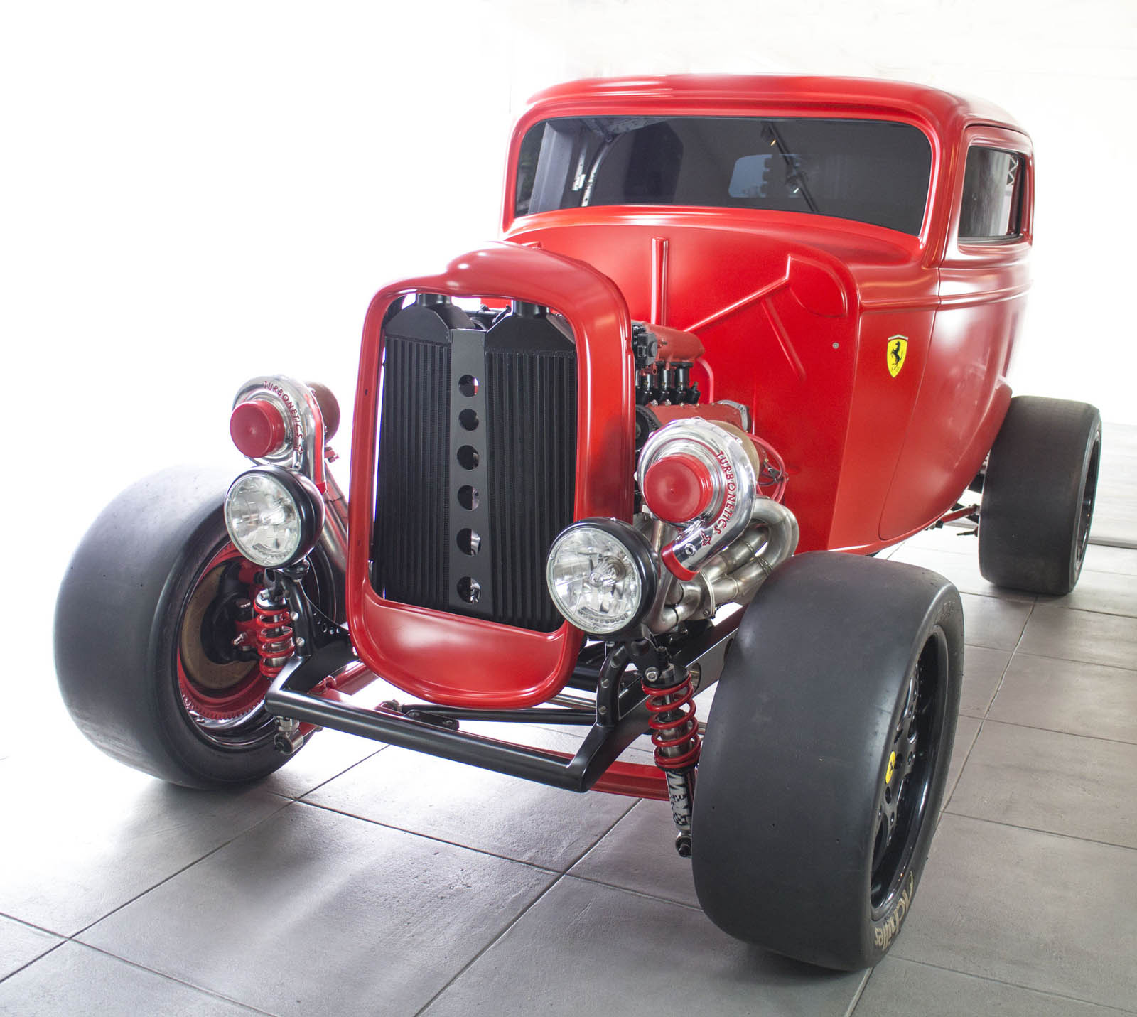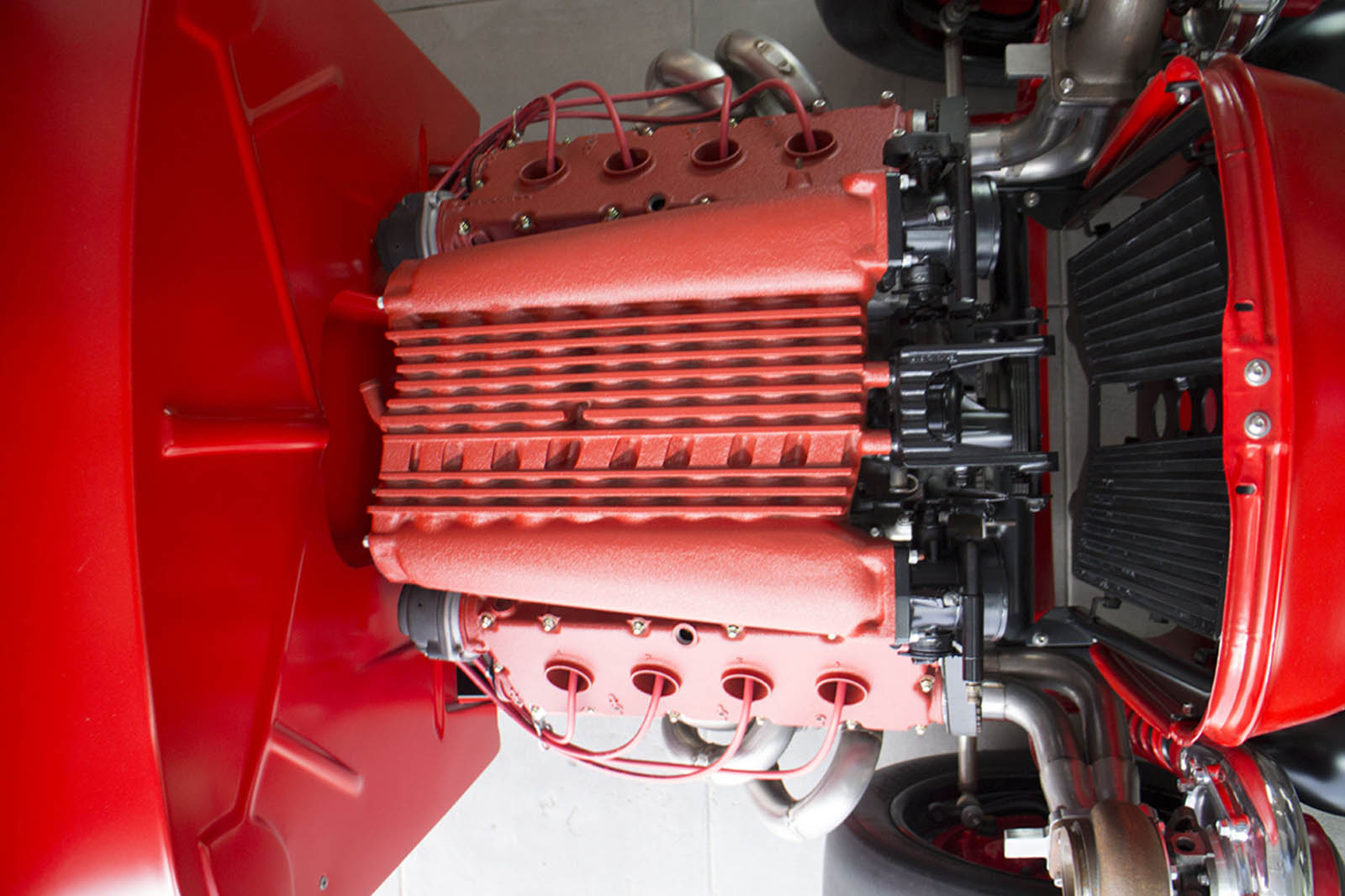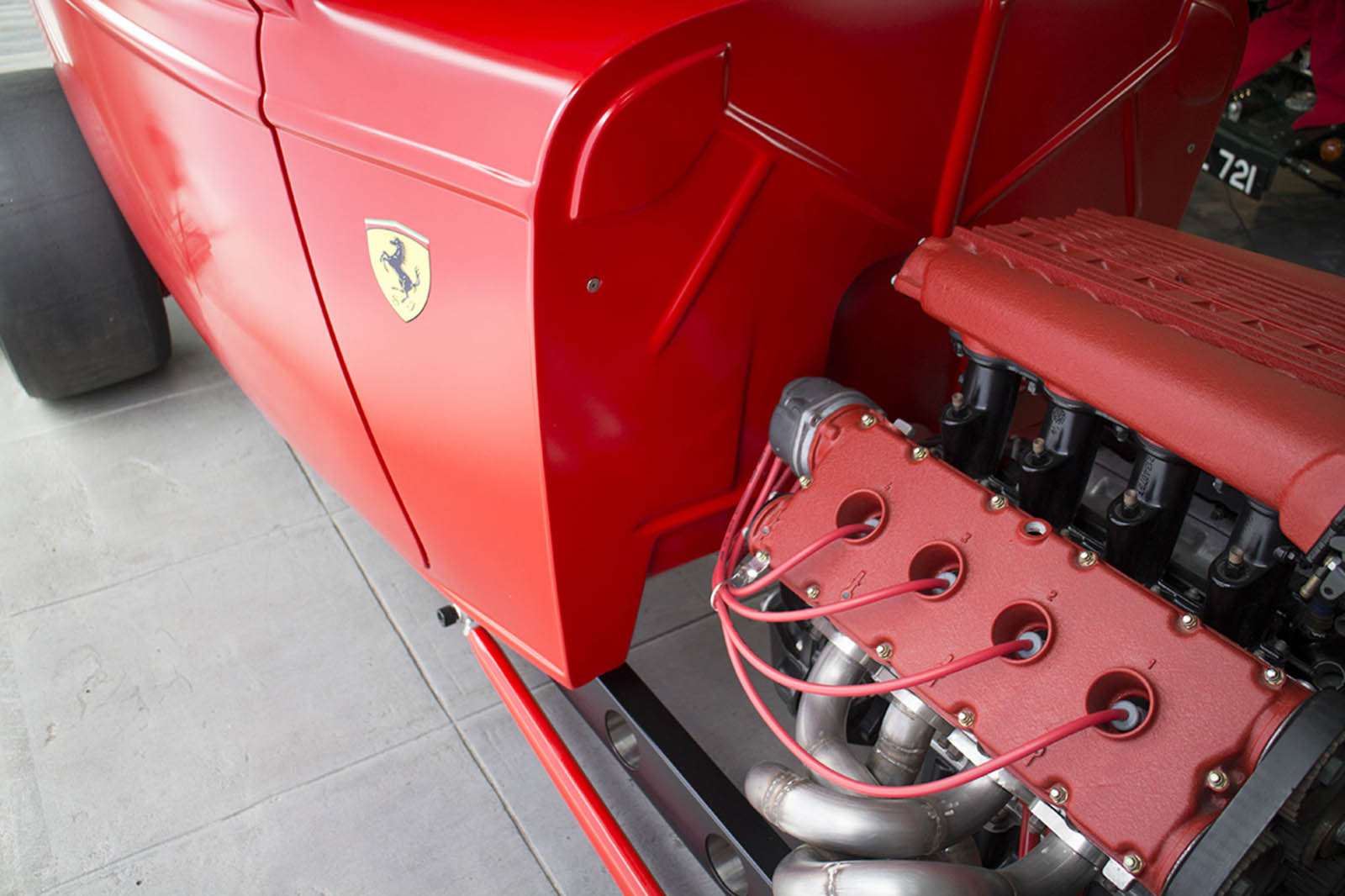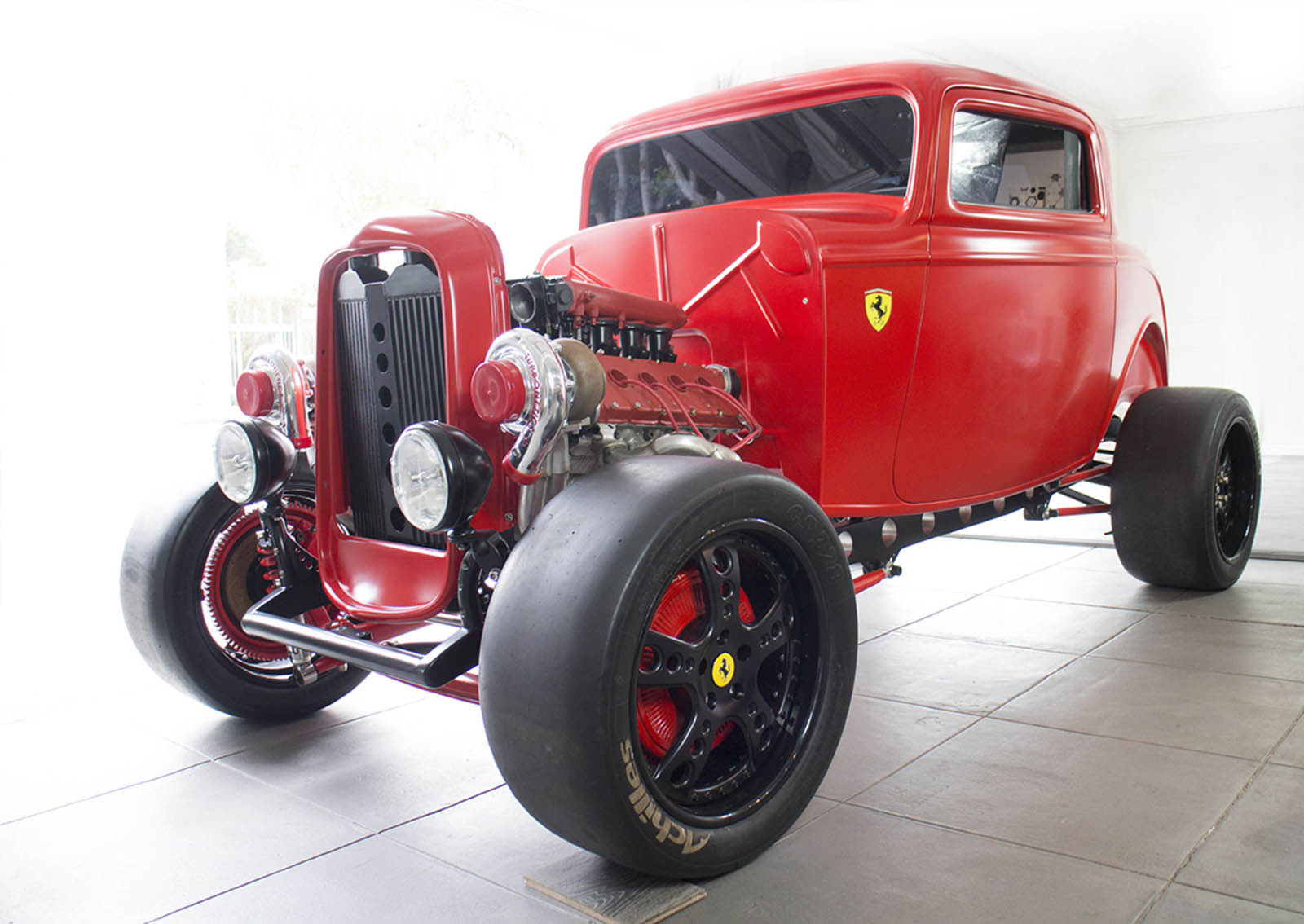 It’s also been equipped with an independent rear suspension, KW shocks, 18-inch alloys, 15-inch disc brakes with four-pot calipers, a full roll cage, five-point harnesses, and a suitably Maranello-esque scarlet paintjob – complete with Prancing Horse shields.