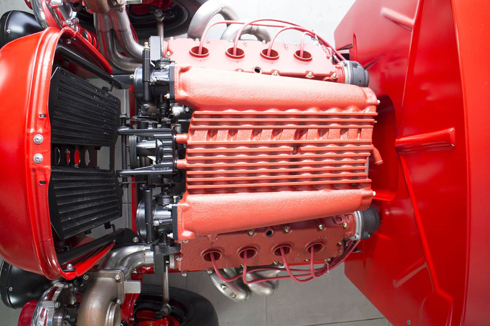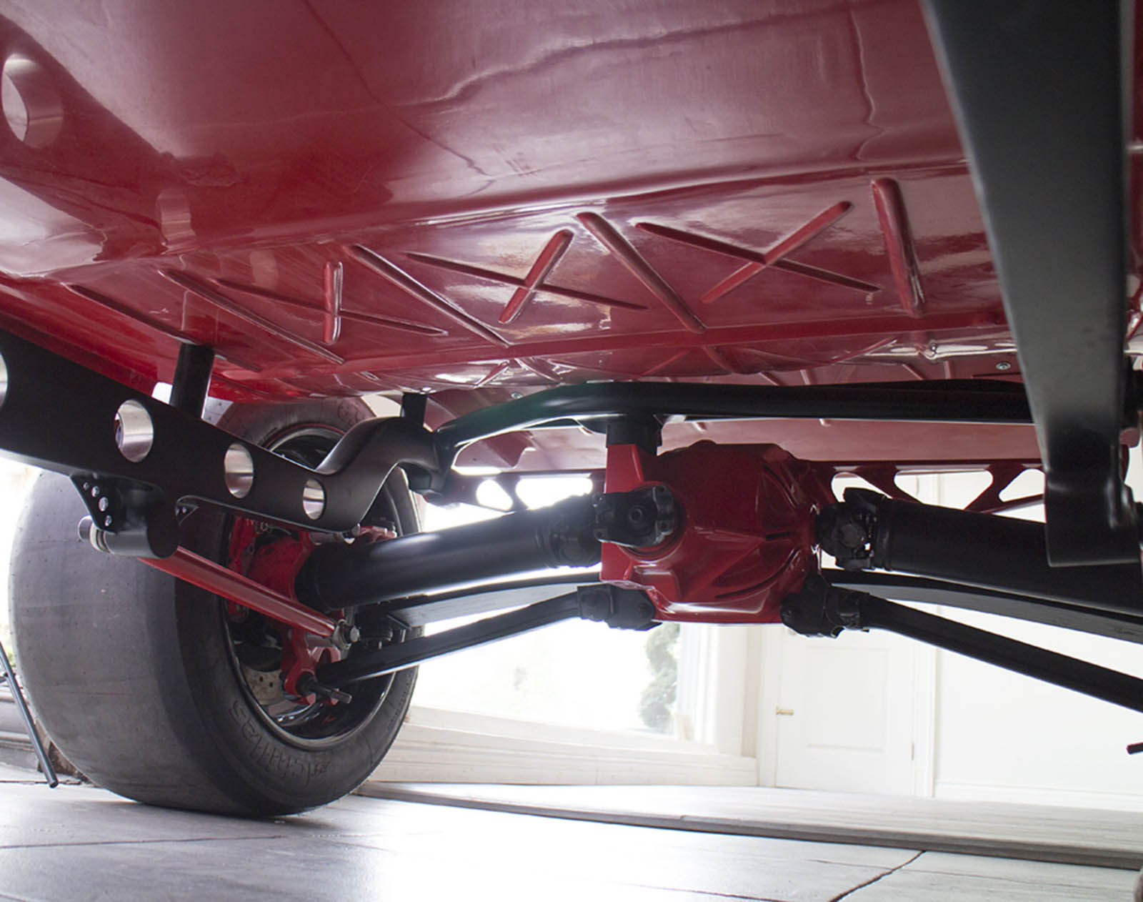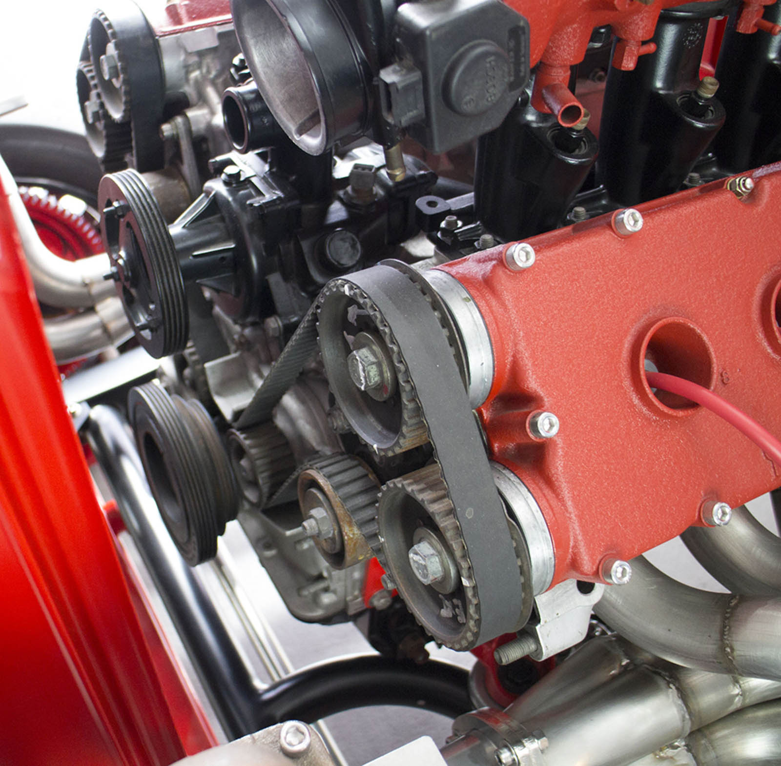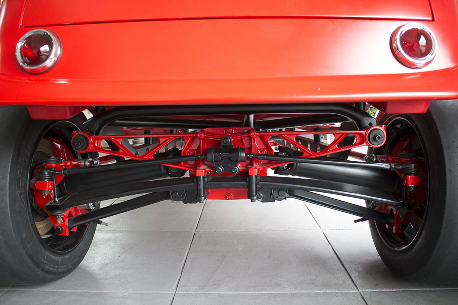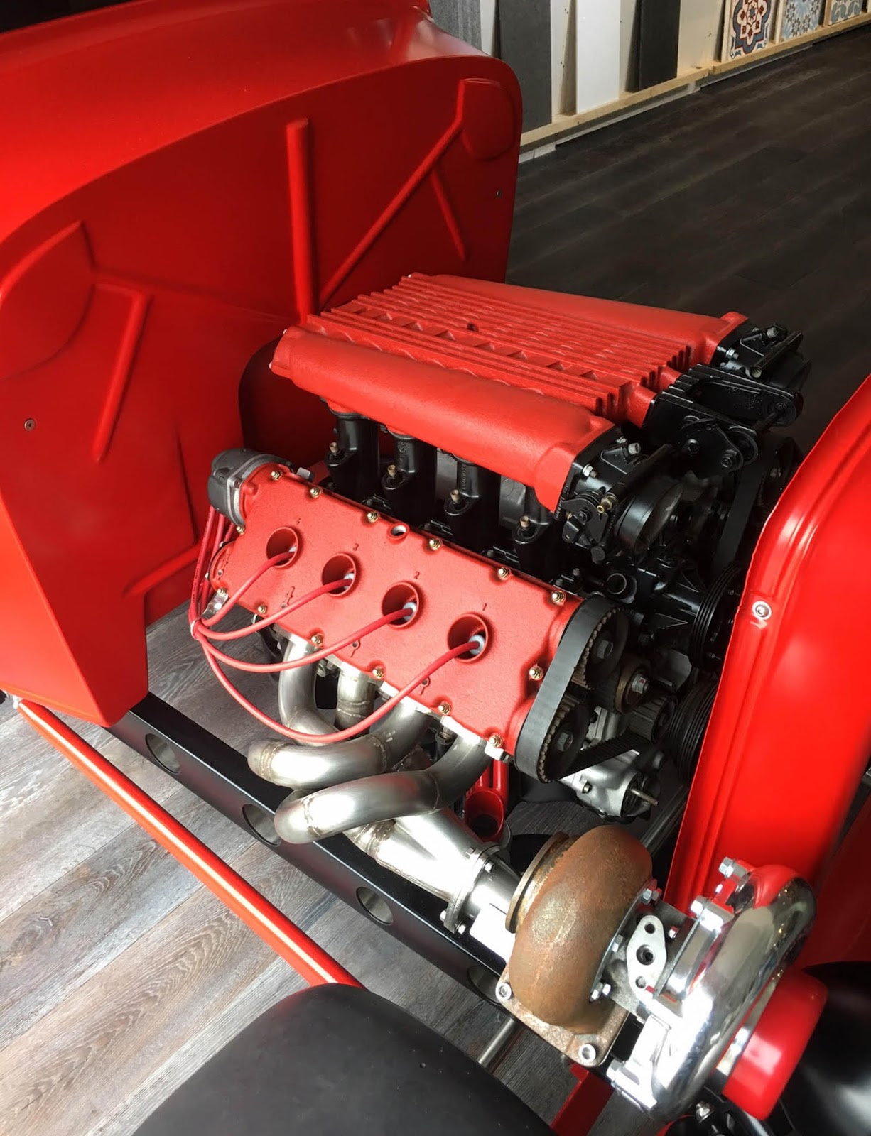 It’s also been equipped with an independent rear suspension, KW shocks, 18-inch alloys, 15-inch disc brakes with four-pot calipers, a full roll cage, five-point harnesses, and a suitably Maranello-esque scarlet paintjob – complete with Prancing Horse shields.