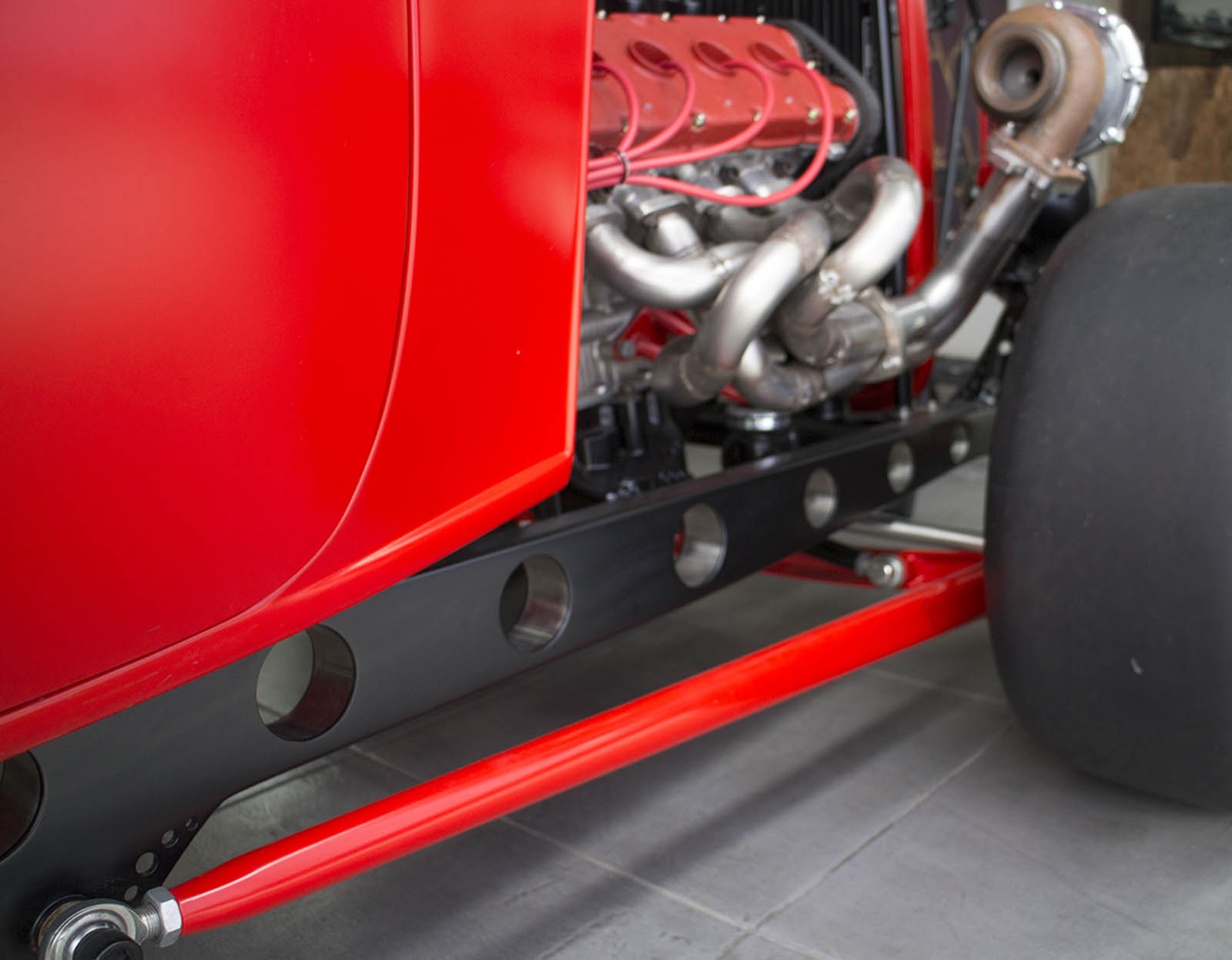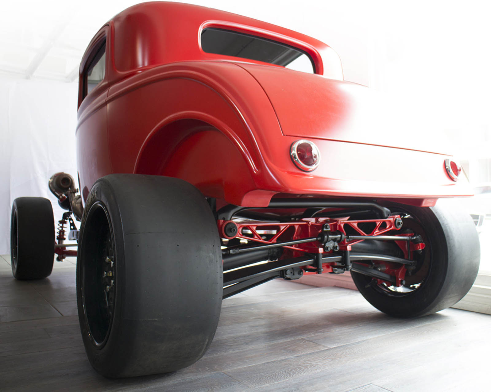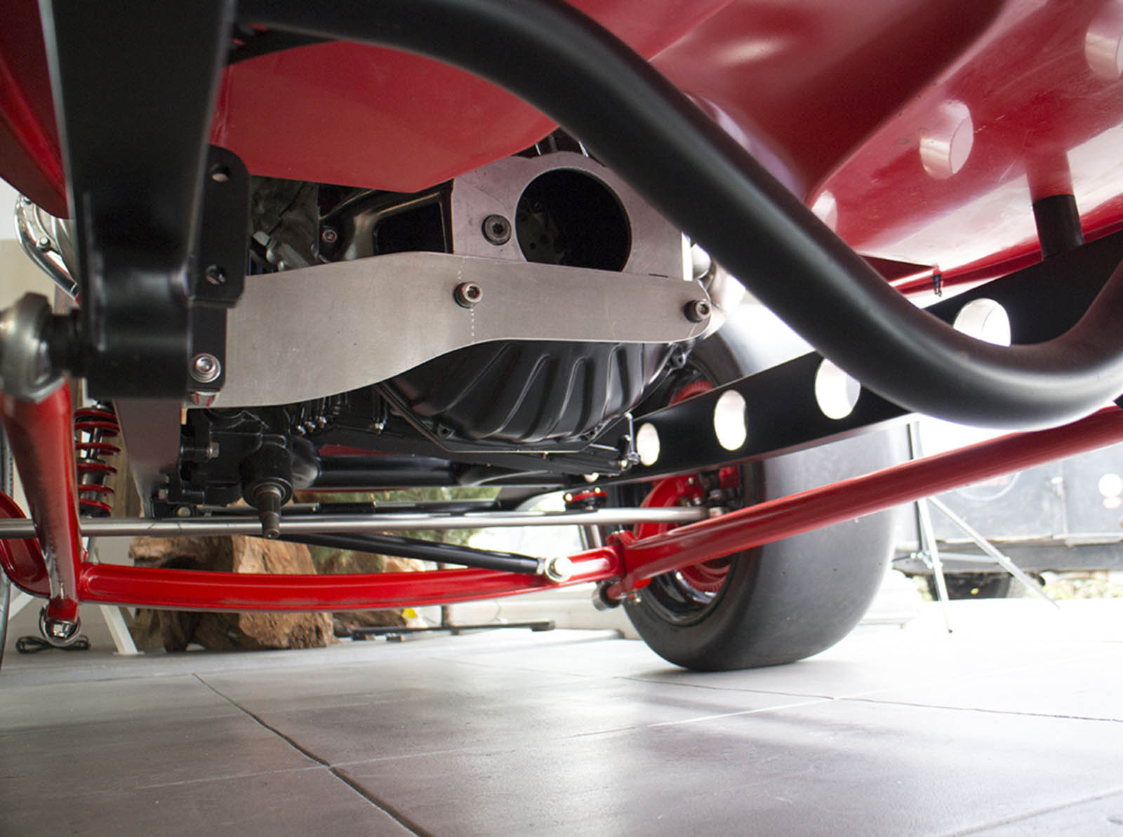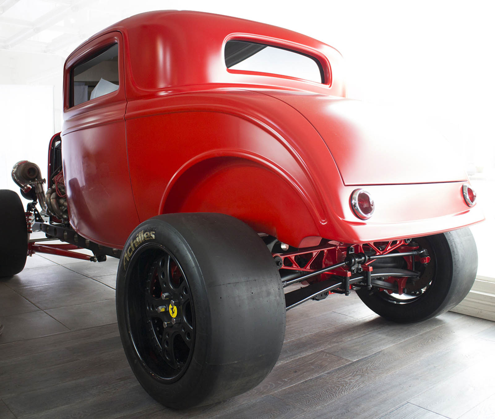 It’s also been equipped with an independent rear suspension, KW shocks, 18-inch alloys, 15-inch disc brakes with four-pot calipers, a full roll cage, five-point harnesses, and a suitably Maranello-esque scarlet paintjob – complete with Prancing Horse shields.