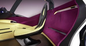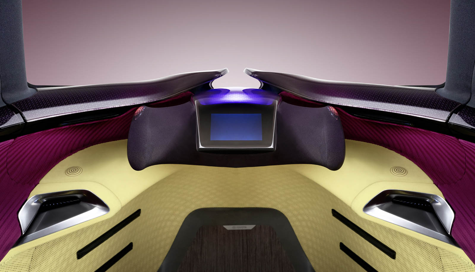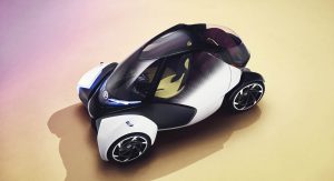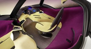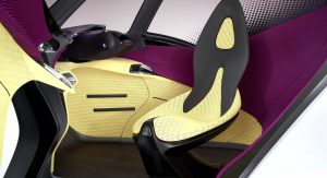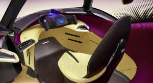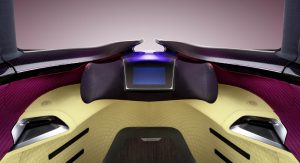 Power comes from an electric motor of unspecified capacity but a range quoted at over 185 miles on a full charge. The vehicle is envisioned to operate autonomously, but when the driver wants (or needs) to take over, there’s no pedals, instrument panel, or even a traditional steering wheel for that matter – just a joystick-like controller and a head-up display. But even in autonomous mode, it alerts the occupants of an impending corner into which it’s about to lean.