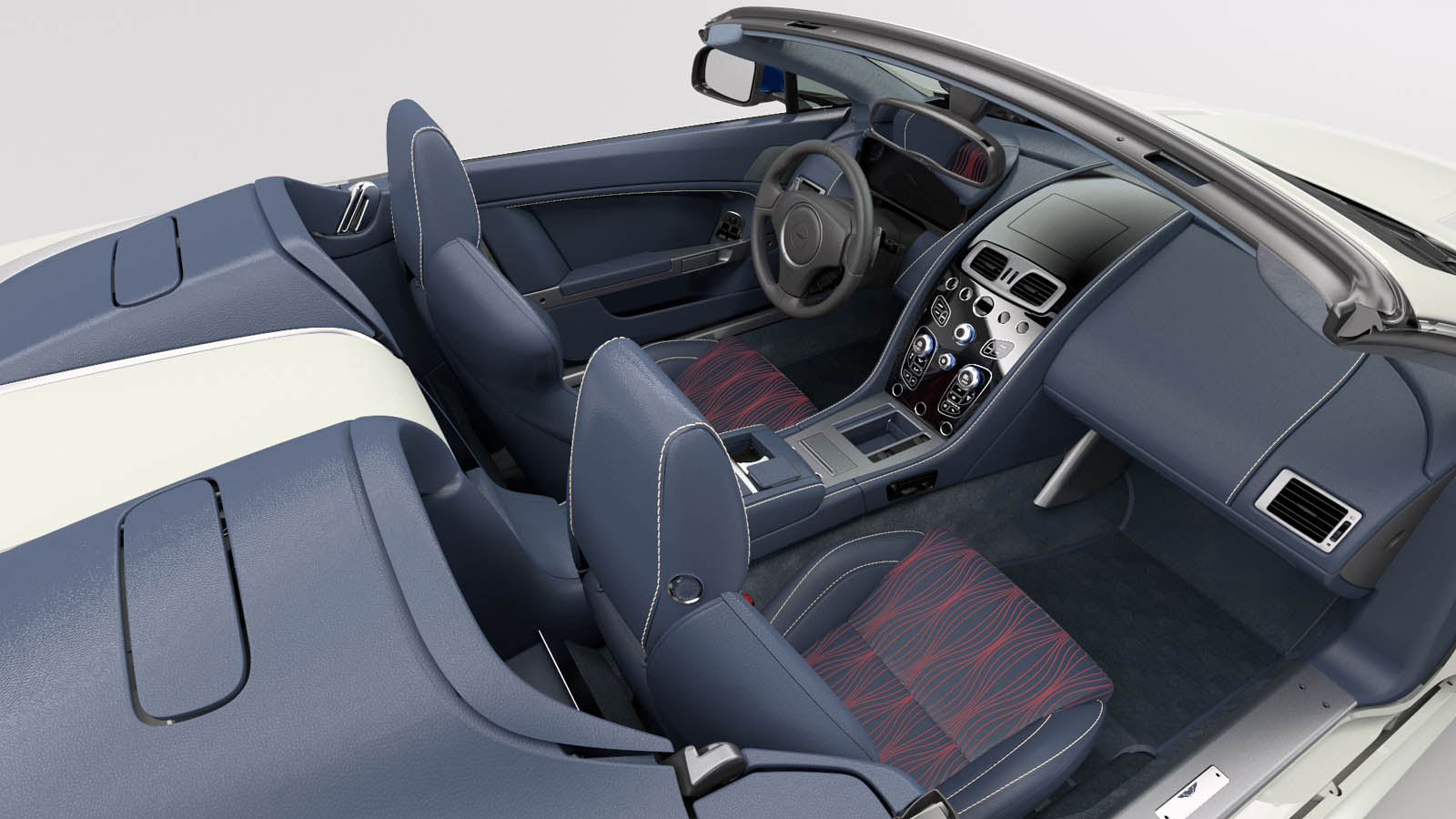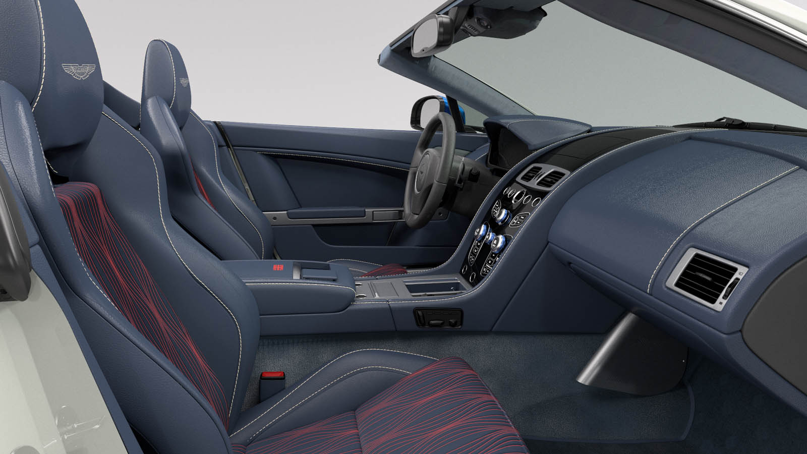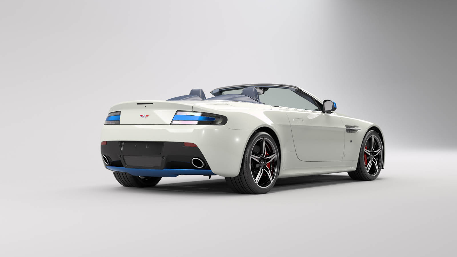 It’s based on the latest eight-cylinder Vantage roadster, done up in Stratus White with blue-tinted mirrors and rear diffuser, plus Union Jack badges to delight Sino Anglophiles. The interior is similarly upholstered in blue leather with wave-quilting reminiscent of what you’d find on some of Aston’s latest Zagato specials, with anodized blue switchgear and British flag embroidery.