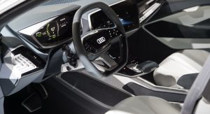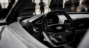 Small cameras replace the conventional door mirrors, and besides the technology advantage, Audi says that these also improve the air flow and reduce the wind noise that is projected in the cabin at high speed. Extended wheel arches, the lack of door handles and the massive 23-inch wheels with a 6-spoke design, complete its imposing exterior.