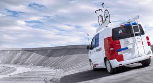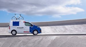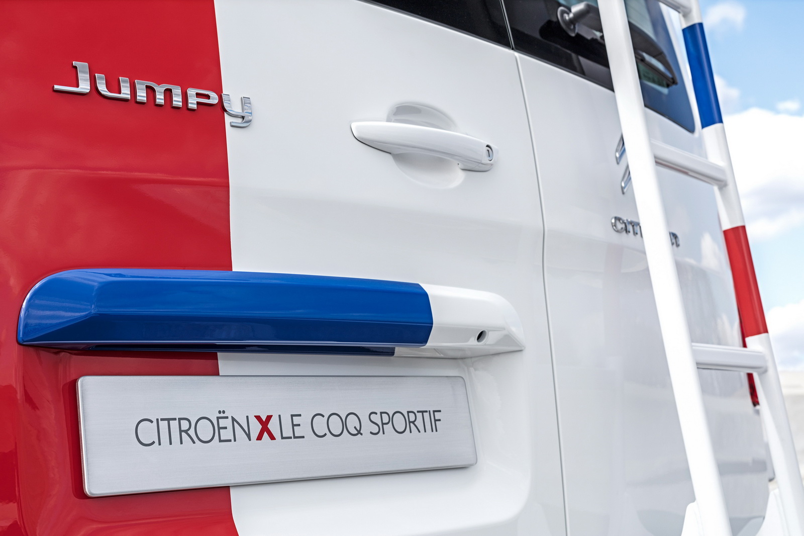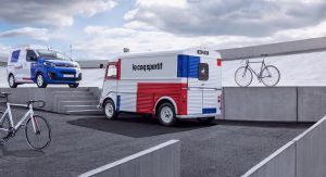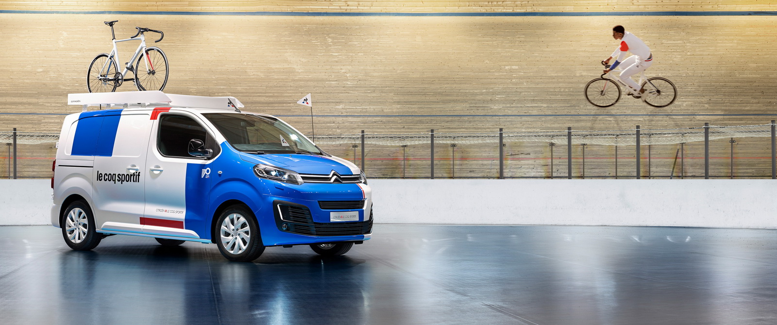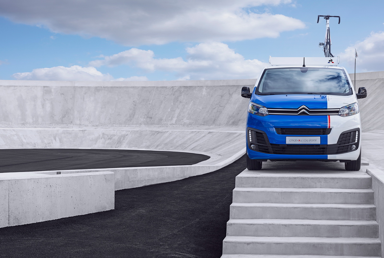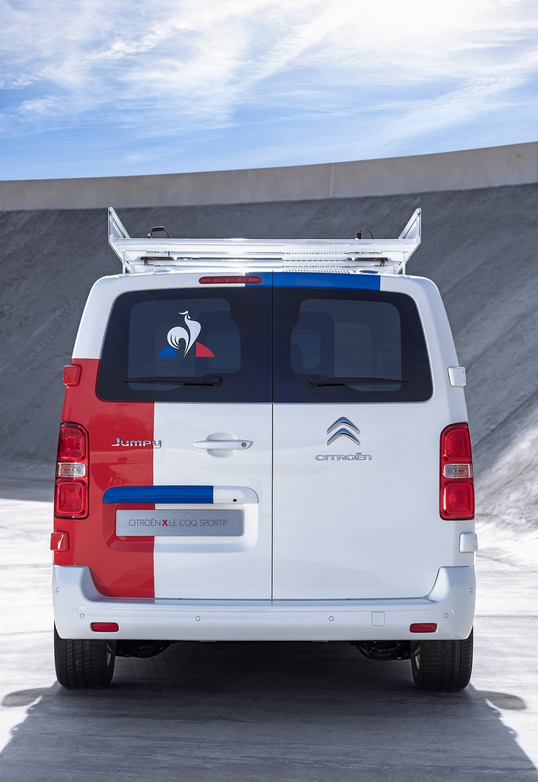 The Citroen Type H has been converted into a mobile bicycle maintenance workshop, and can also be transformed into a workshop for clothing at cycling events, demonstrating its versatility, and so has the New Dispatch, which wears the same white, blue, and red colors.