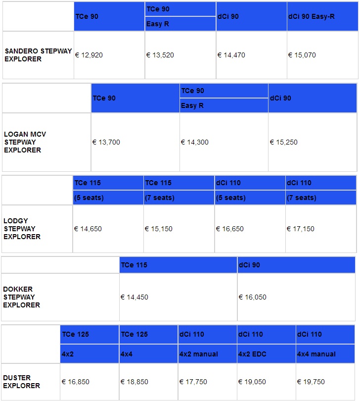 Prices commence at €12,920 ($13,782) for the Dacia Sandero Stepway Explorer, while the Logan MCV Stepway Explorer can be had from €13,700 ($14,614). The Lodgy and Dokker will set you back for at least €14,650 ($15,627) and €14,450 ($15,414), respectively, and the Duster comes from €16,850 ($17,974).