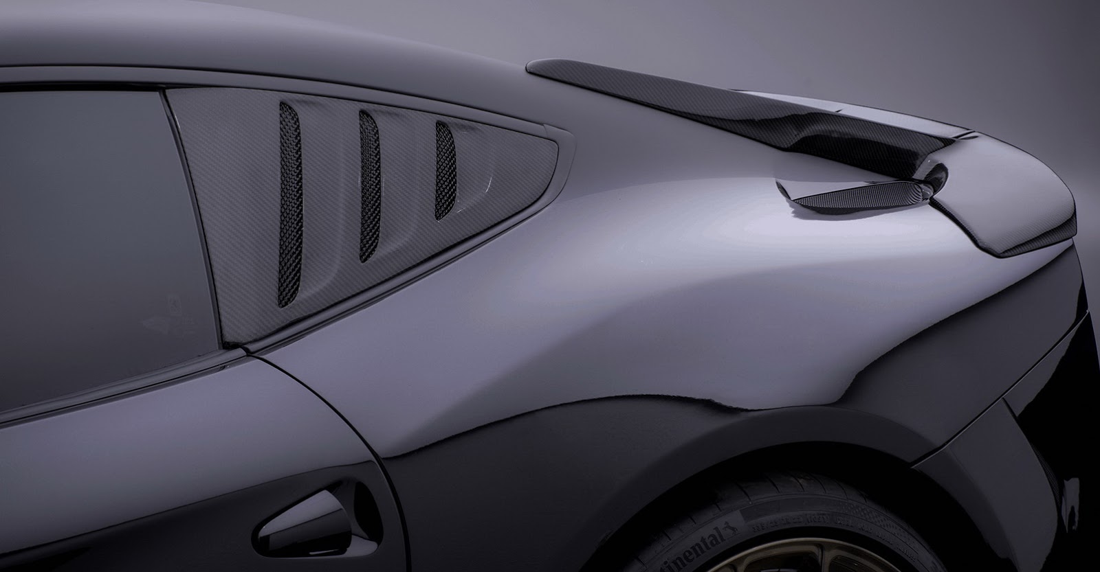 Here’s a rundown of all the custom components installed on this F12. It’s wearing an Onyx Aero F2X front bumper, a lower carbon aero splitter, front side vented aero bridge, side carbon sills (including fins), custom rear bumper, plus the carbon long tail split diffuser, tail spoiler and roof section.