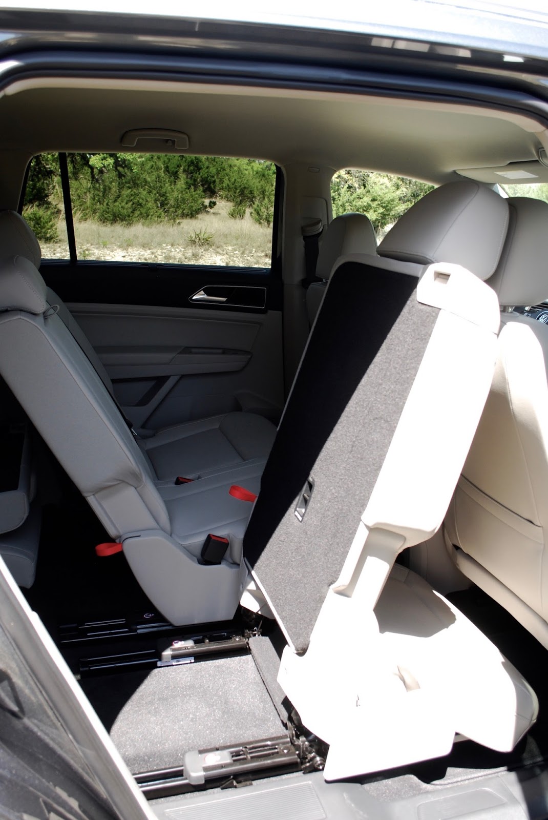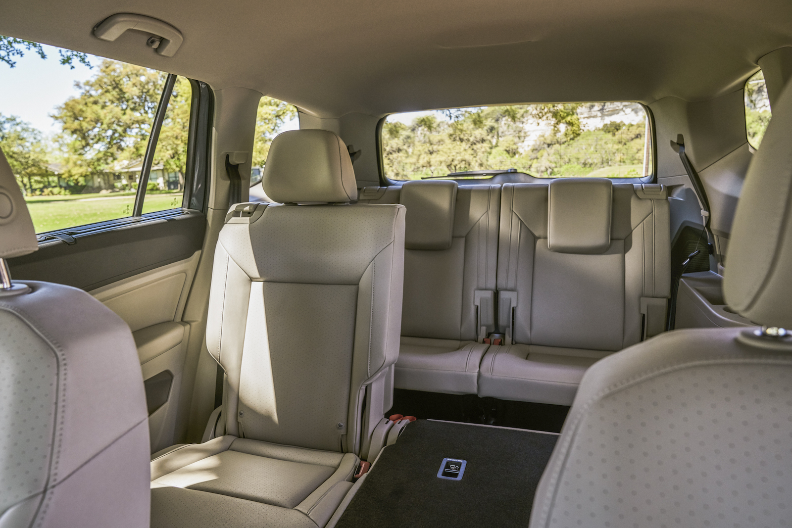 The effect is dramatic. The standard second-row bench seems conventional until you pull the lever under the outboard seats and find you can slide them back to get absurdly generous legroom. But you’ll have to move them a bit to give the two occupants in the third-row seats any legroom. Do that and lift one lever to reveal a huge space to actually get back in the third row (like the Nissan Pathfinder, it works even with a child seat strapped in). The Atlas has a third row seat even adults would find habitable, down to the air vents that are also mounted back there.