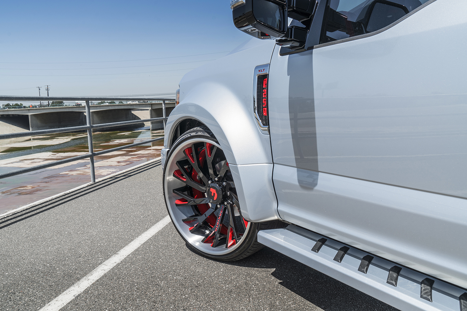 His Majesty has taken a Ford F-250 XLT, blistered out the wheel arches, dropped it to the ground, and fitted it with a set of 26-inch Forgiato Sincro wheels – custom-painted with black and red spokes and silver rums to match the truck’s bodywork.
