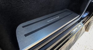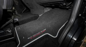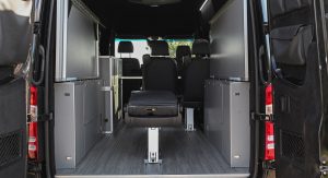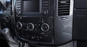 Other features applied to the van include the decorative parts of the dashboard that have a black-glossy carbon design, flat-bottom steering wheel, and brushed stainless steel entry strips and milled pedal pads.