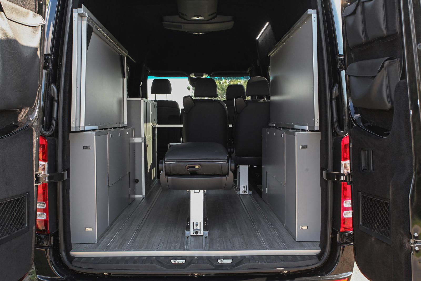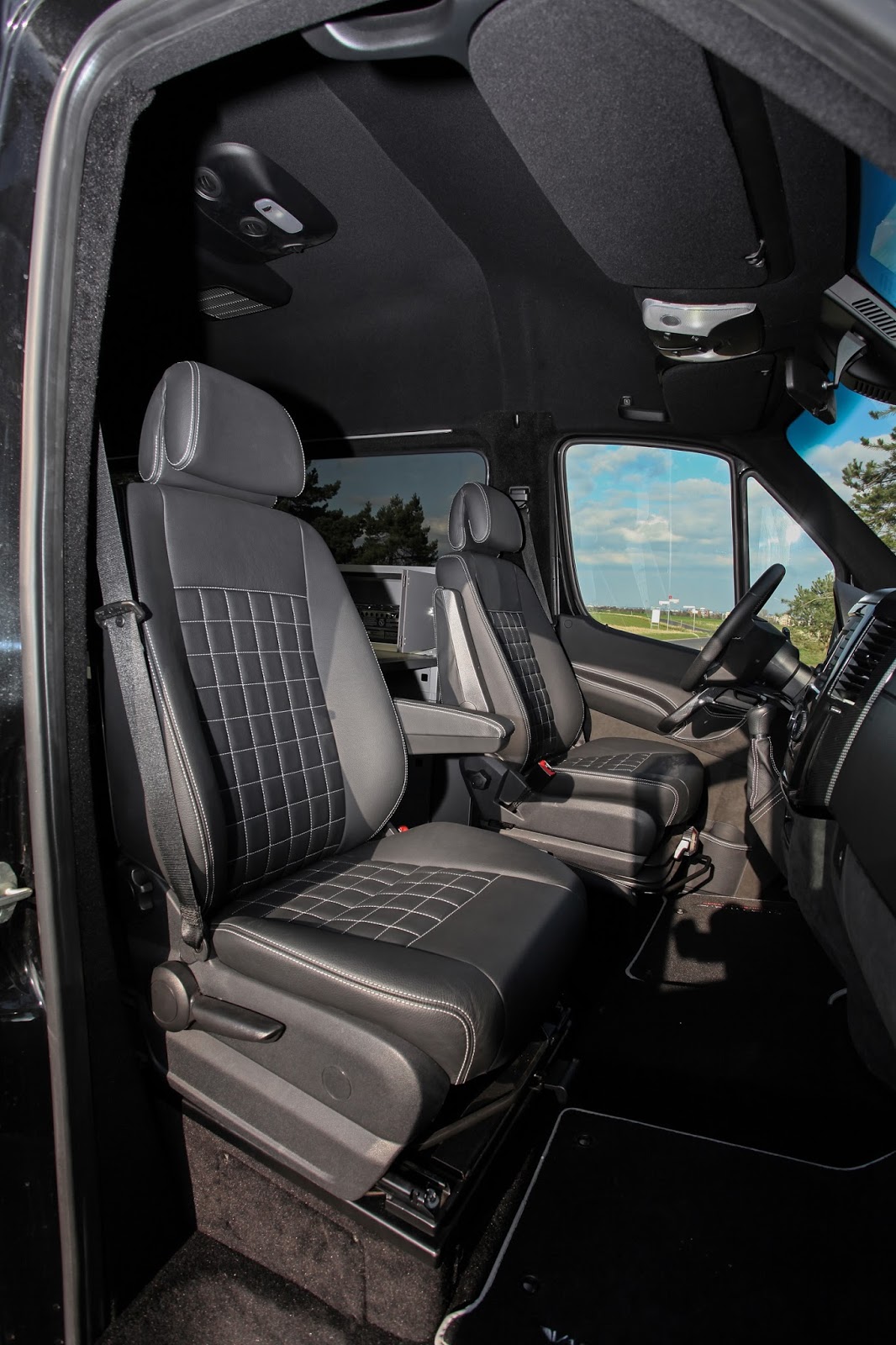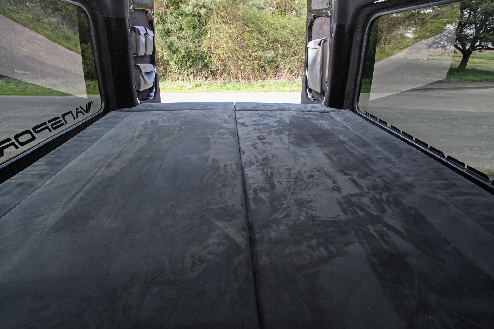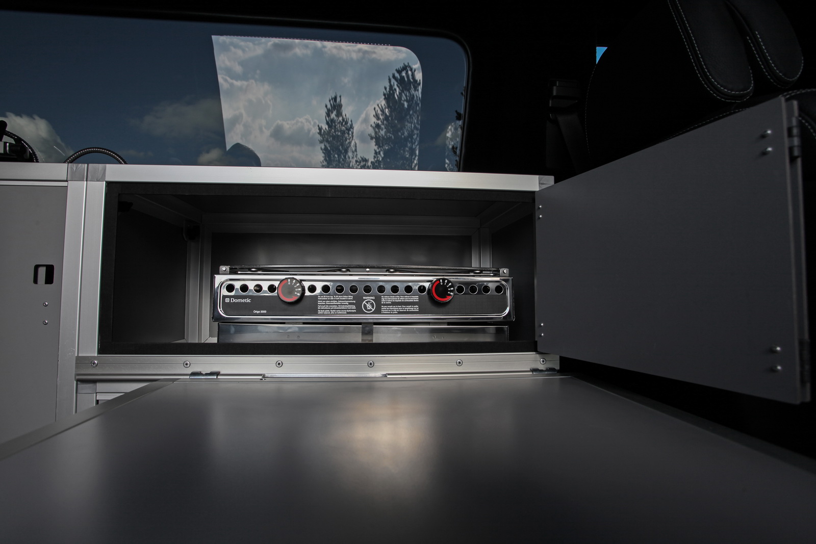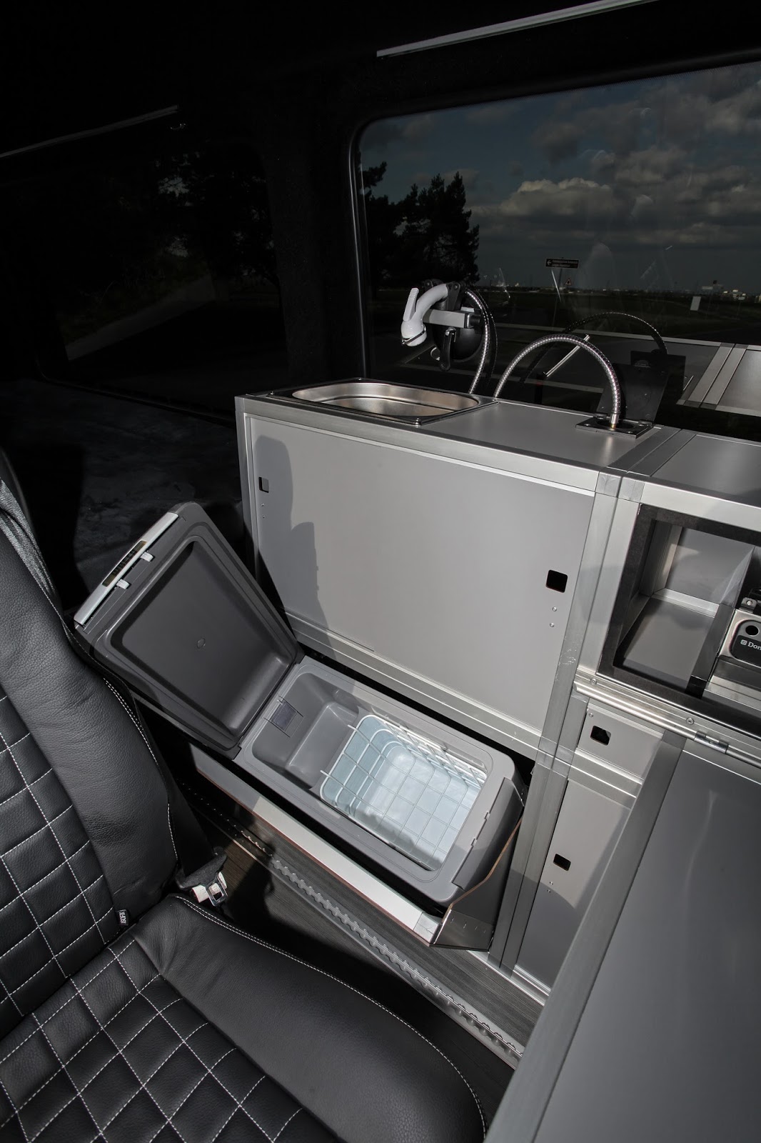 Inside, they gave it an anti-drumming product on the roof and sidewalls, followed by additional isolation, subsequent to which the tuner installed a modular aluminum system floor by Schnierle to secure the single seats, and camper furnishings.