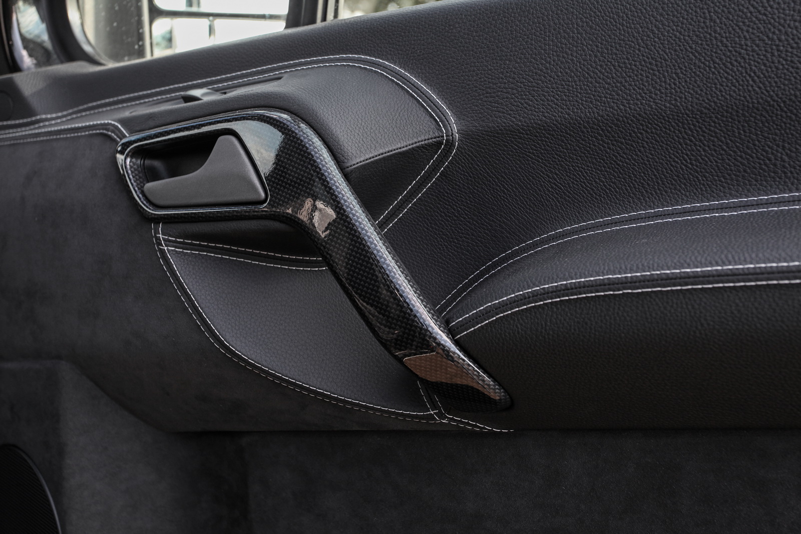 Other features applied to the van include the decorative parts of the dashboard that have a black-glossy carbon design, flat-bottom steering wheel, and brushed stainless steel entry strips and milled pedal pads.