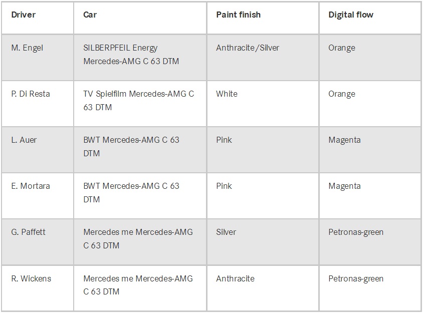 Newcomer Edoardo Mortara and Austrian driver Lucas Auer will put two Pink Panthers through their paces, with Magenta digital flow on their sides, whereas DTM returnee Maro Engel will drive an anthracite/silver racer, and 2010 DTM Champion Paul Di Resta will join the hunt for points in a white model. Both latter cars have an orange digital flow on their sides.