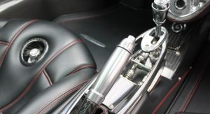 Inside, black leather dominates most of the surfaces, with contrast red stitching, bare carbon fiber, and aluminum bits.