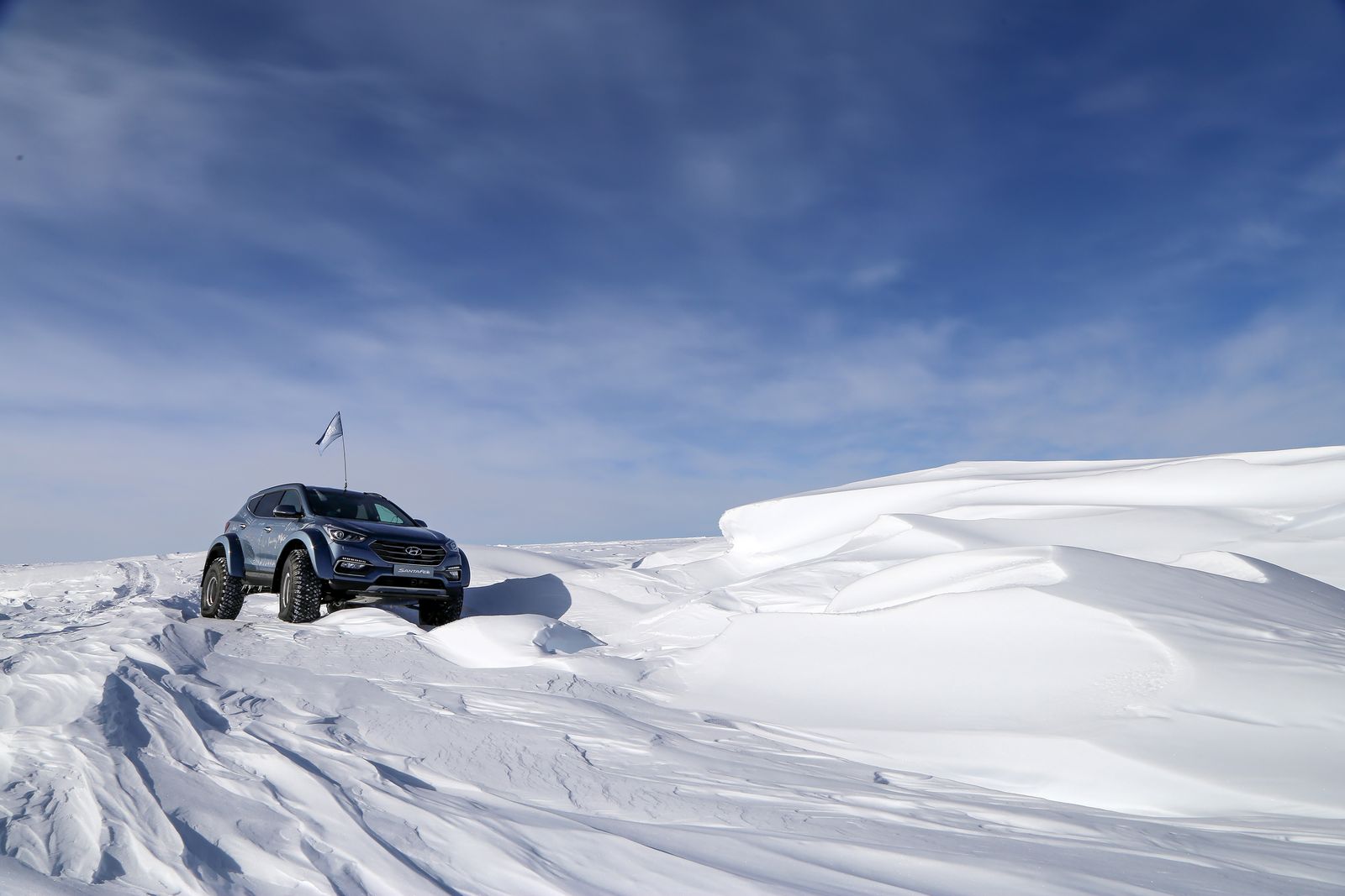 Throughout the treacherous journey, the team had to cross the Ross Ice Shelf. This huge glacier lies beyond the continental land mass, is hundreds of feet deep and is filled with deep, hard-to-see fissures. The Hyundai became the first passenger vehicle to drive across the glacier and was tethered to three support trucks in case one of them fell into the abyss.