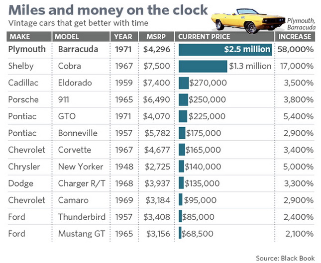 According to vehicle valuation specialists at Black Book market research group, the Barracuda reigns supreme when it comes to valuation over time. In second place, as you can see in the graph below, sits the 1967 Shelby Cobra (17,000% & $1.3 million), followed by the likes of the 59′ Cadillac Eldorado (3,500% & $270k) or the 65′ Porsche 911 (3,800% & $250k).