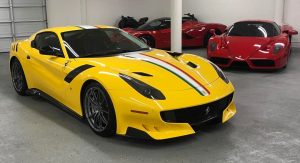 His rare 1964 Ferrari 250 GT Lusso is uniquely decked out in Competizione spec (more often found on the SWB model) in yellow with Tricolore stripes. So he ordered his F12 TdF to match. The resulting supercar bears his initials, and – though ostensibly mechanically identical to any of the other 798 TdFs to be made – will remain one-of-a-kind in its cosmetic appearance.