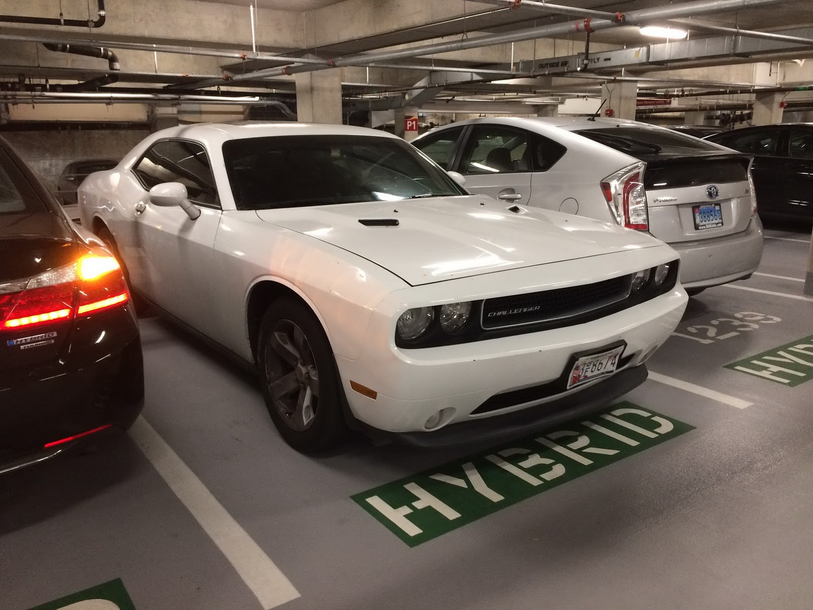 Resting your Dodge Challenger next to a Toyota Prius and Honda Accord Hybrid would be sufficiently ironic even without the former occupying a hybrid-only parking spot.