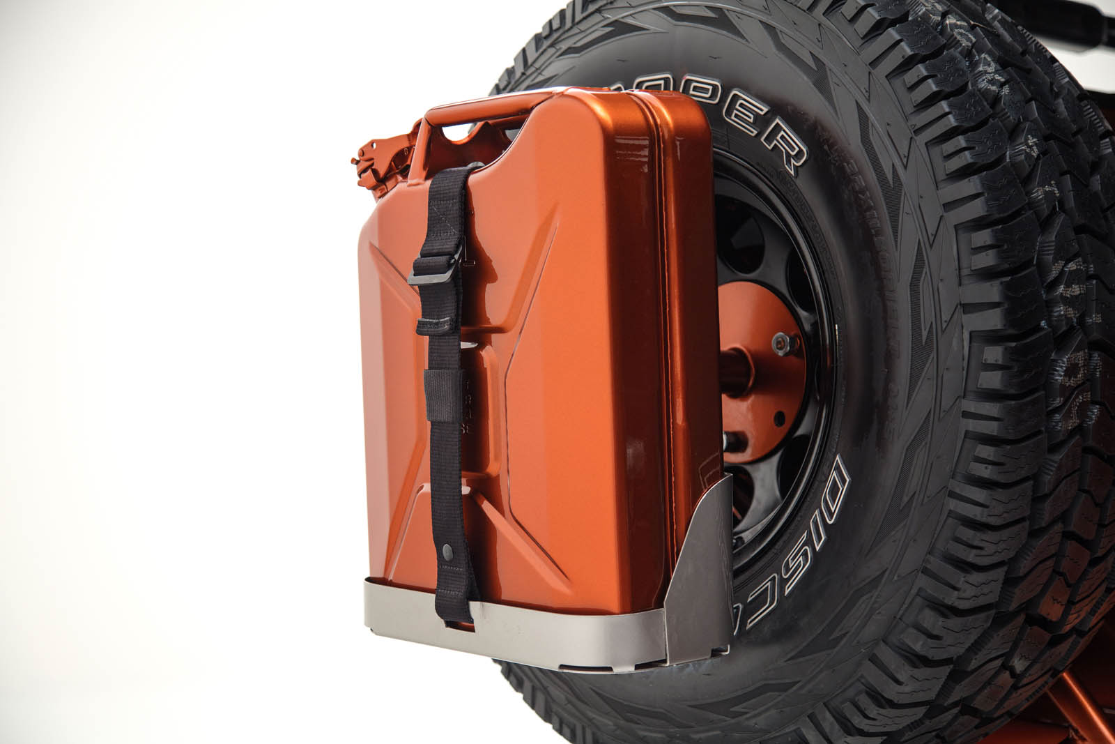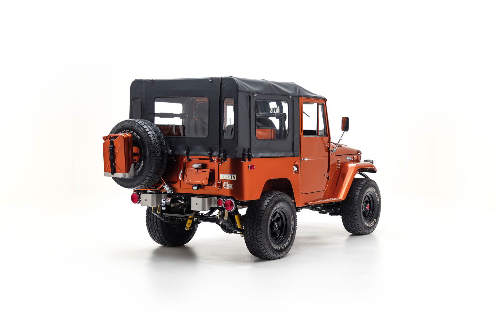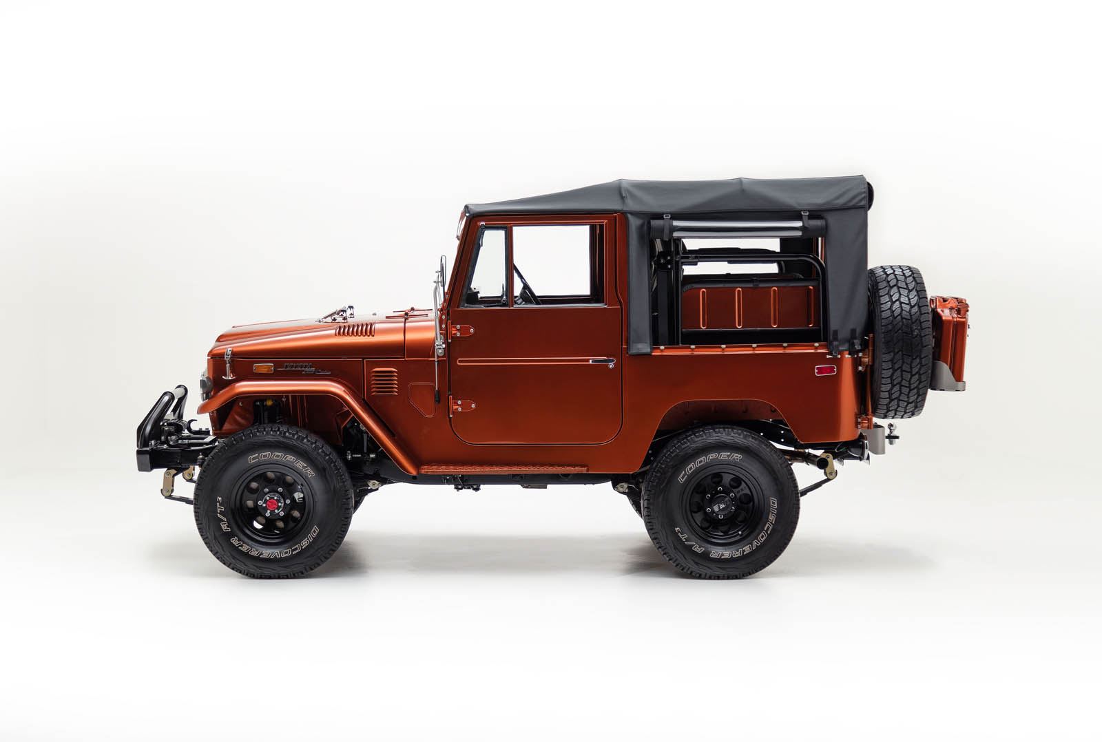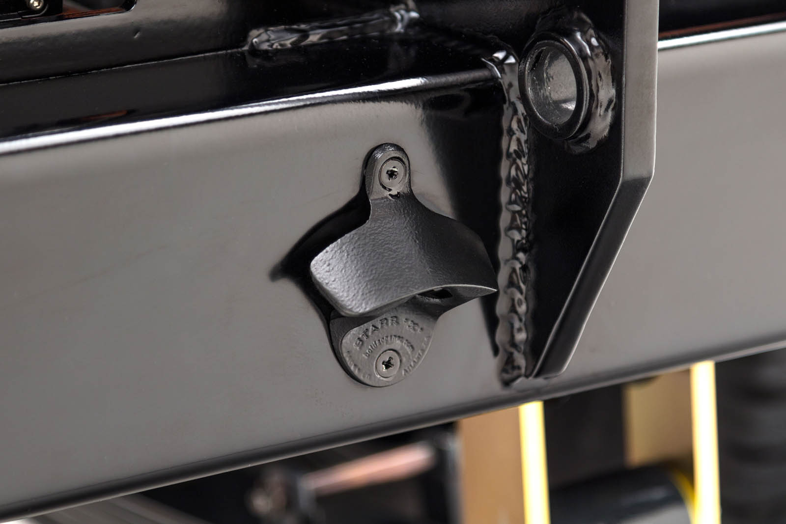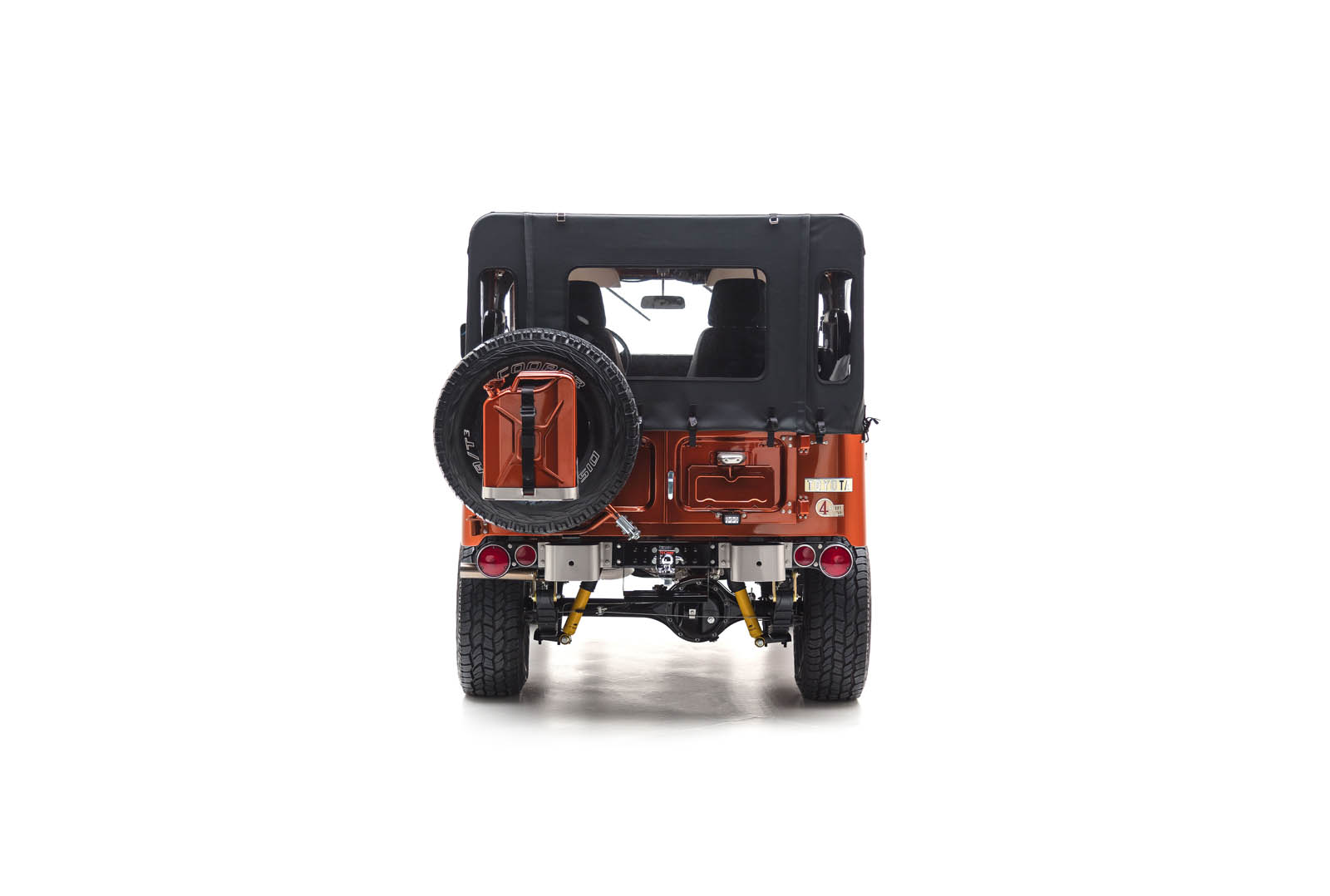 For starters, the copper paintjob is sure to make it stand out among the legions of these Japanese workhorses still on (and off) the road. The wheels, soft top, and interior have been fitted in black, with heated Corbeau seats and marine-grade audio system. It also features LED headlights, power steering, tow hitch… even a bottle opener in the front bumper that’s become the company’s signature touch.