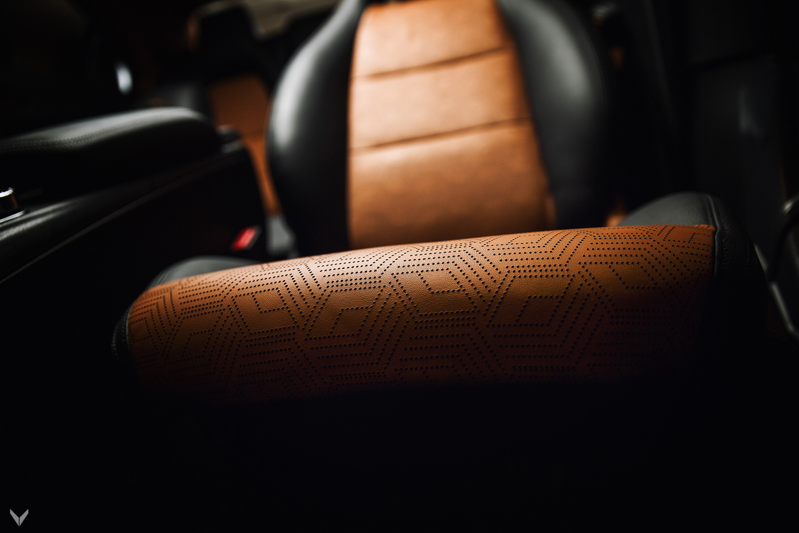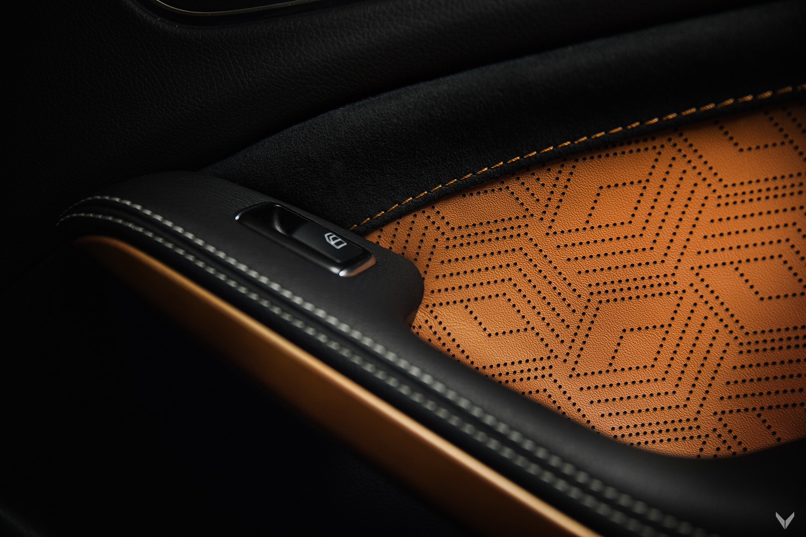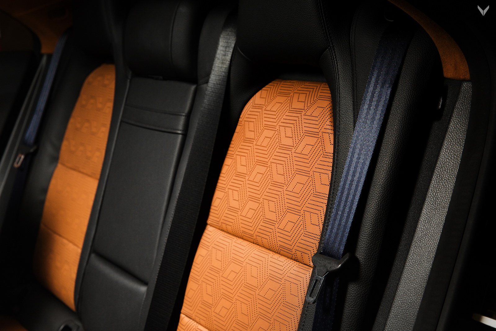 The fine perforation with 3D effect was the most expensive part of the customization, a first for the Bulgarian company, who also changed the middle sections of the seats and door panels.