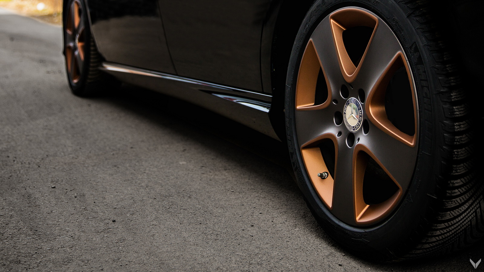 Additionally, the compact four-door coupe received darkened taillights, a glossy black look for the 3-pointed star logo on both ends, the tuner’s signature on the boot lid, and 17-inch dual-tone ‘Gunmetal Light Graphite/Honey Bronze’ rims.