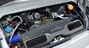 The exterior has also been overhauled with almost every single body panel new. This includes the remodelled front and rear fascias, the huge roof scoop, custom wheels and a rear wing that’s reminiscent of those from RWB.