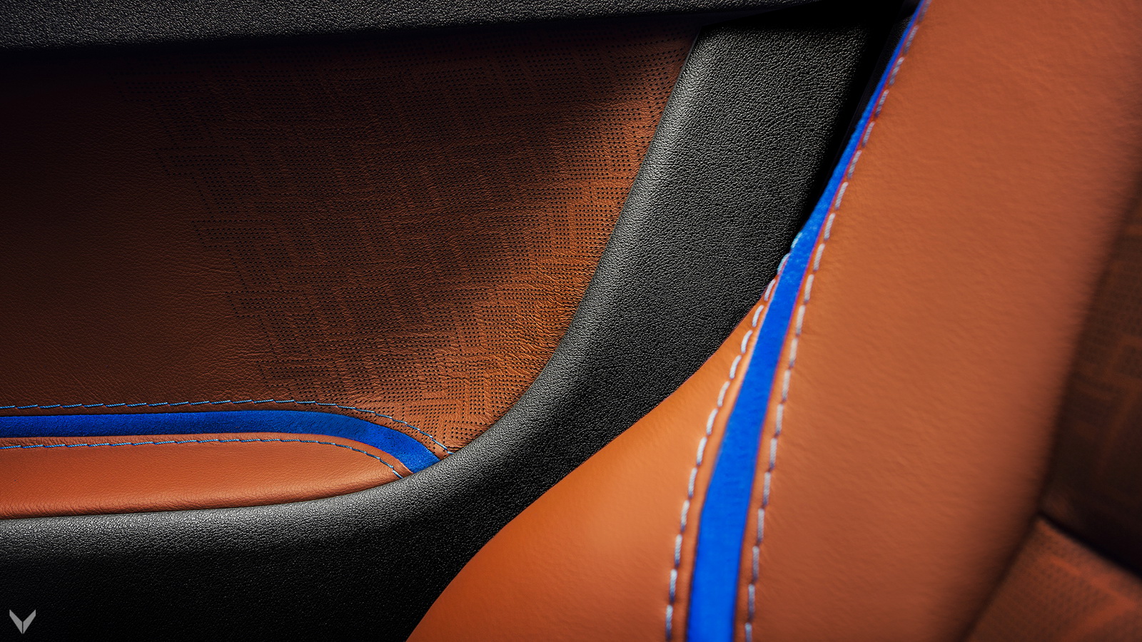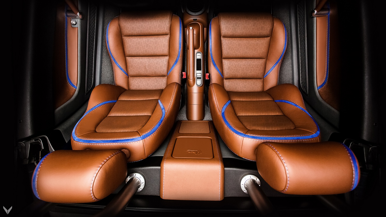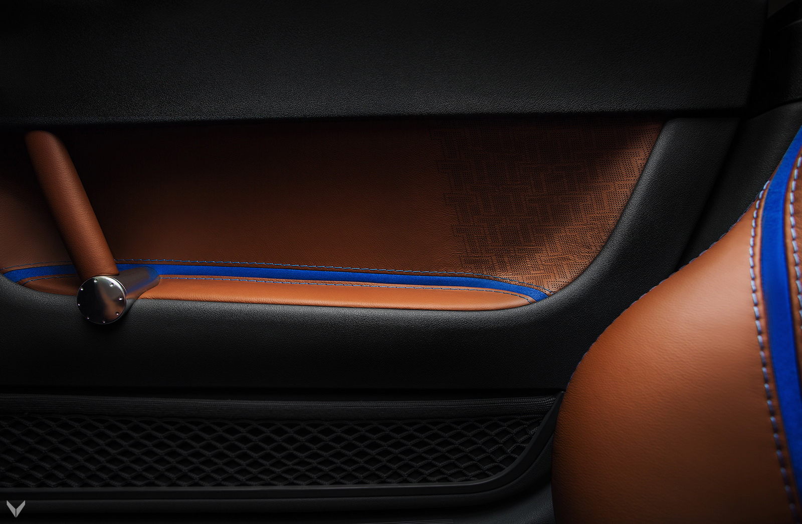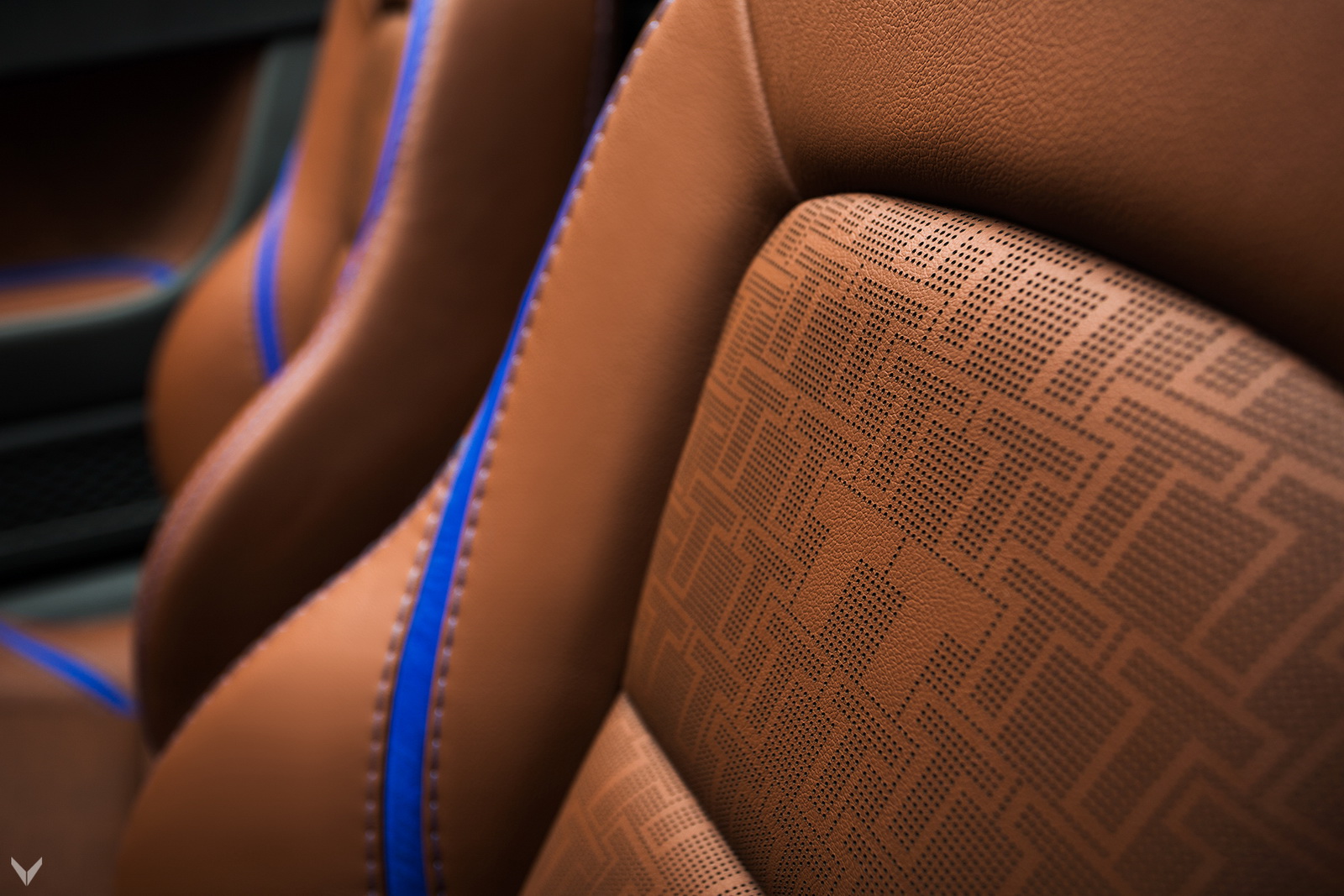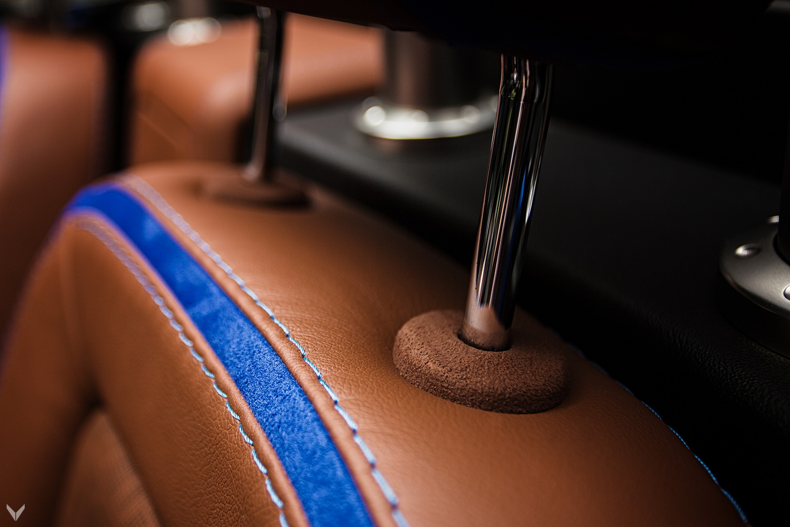 Going through the Bulgarian tuner’s therapy meant having most parts of the cabin wrapped in brown and black leather, contrasted by the Alcantara stripes on the seats and door panels, blue seatbelts, and blue stitching on the flat bottomed steering wheel.