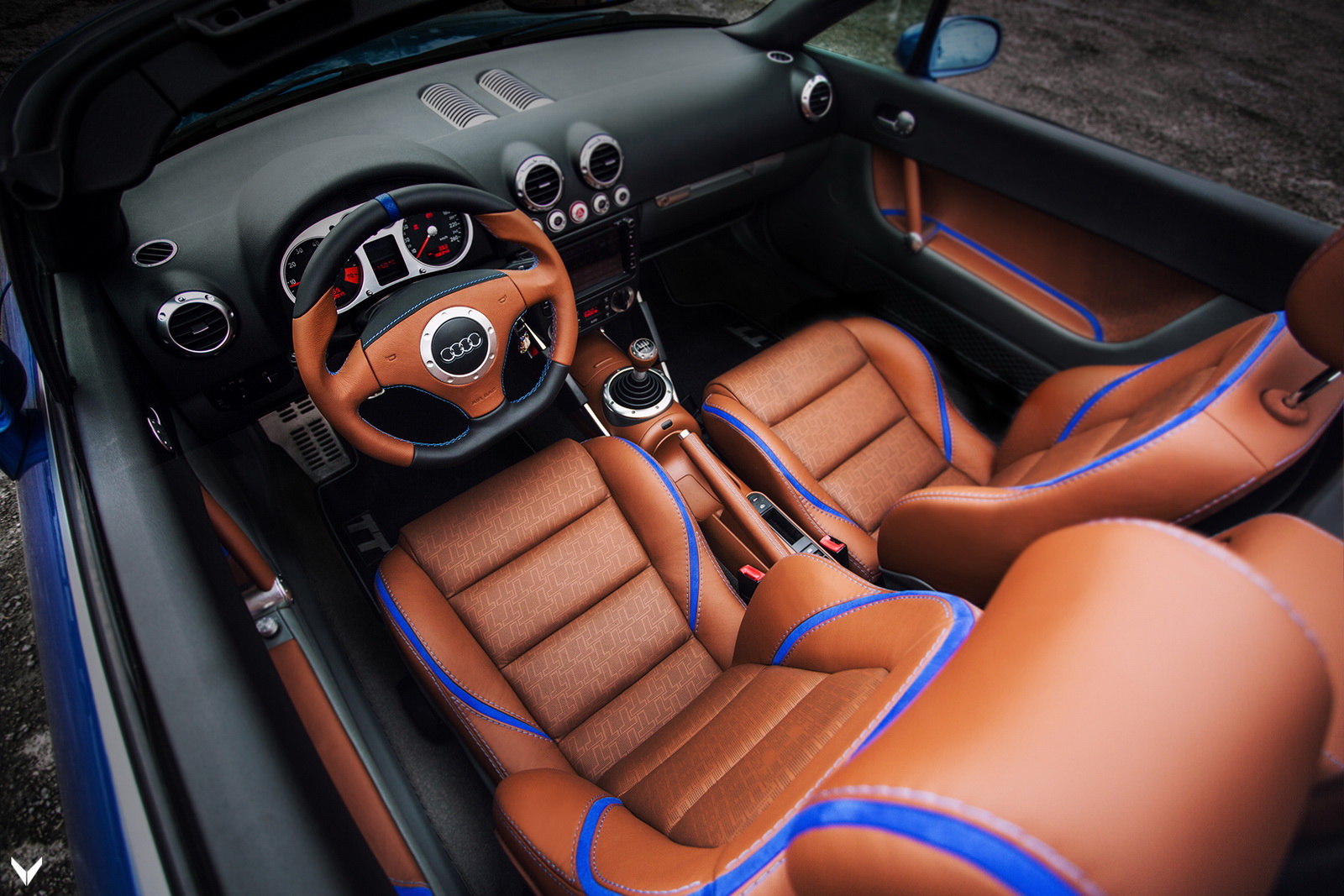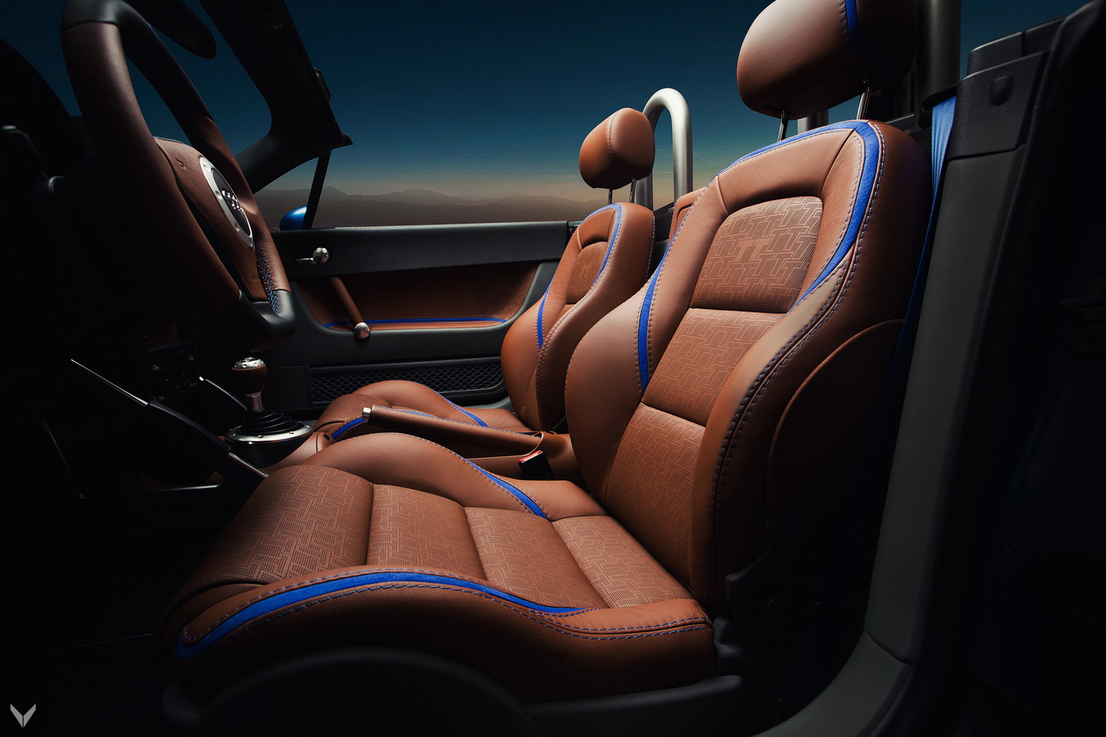 Those standing besides it can also notice the non-perforated TT logo on the backrests, opaque leather finish for the washer-like plastic pieces on the bottom of each headrest stem, and the central console painted in soft brown, which rounds up the list of modifications.