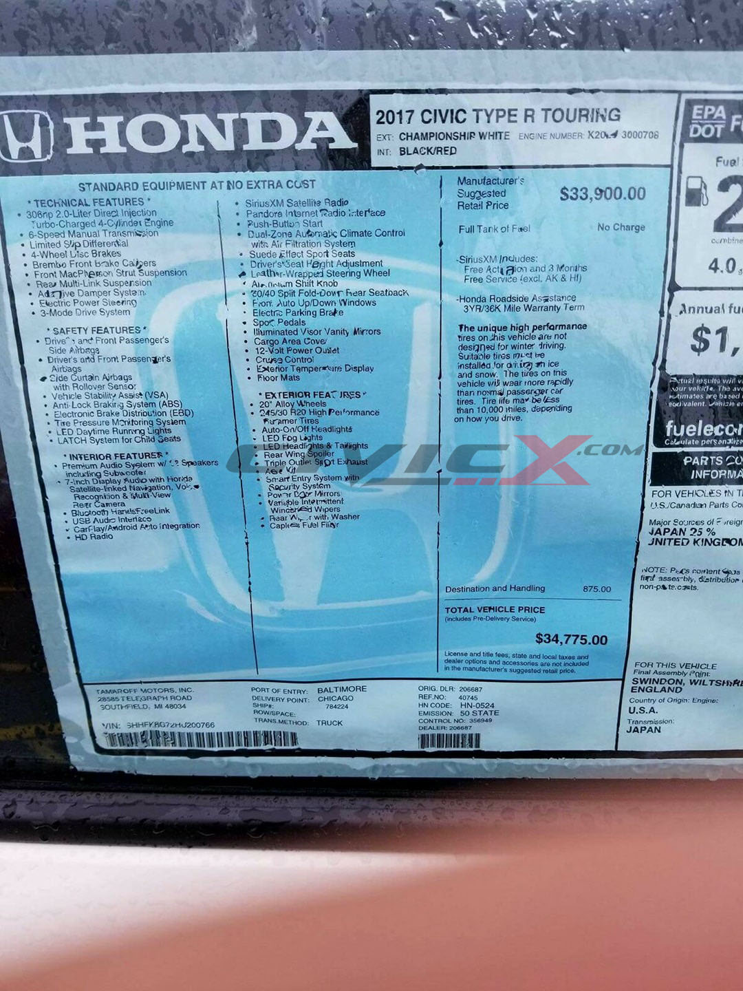 Honda is gearing up to launch the highly anticipated Civic Type R in the United States and CivicX has managed to get a hold of a photo which shows the model will have a base price of $33,900.