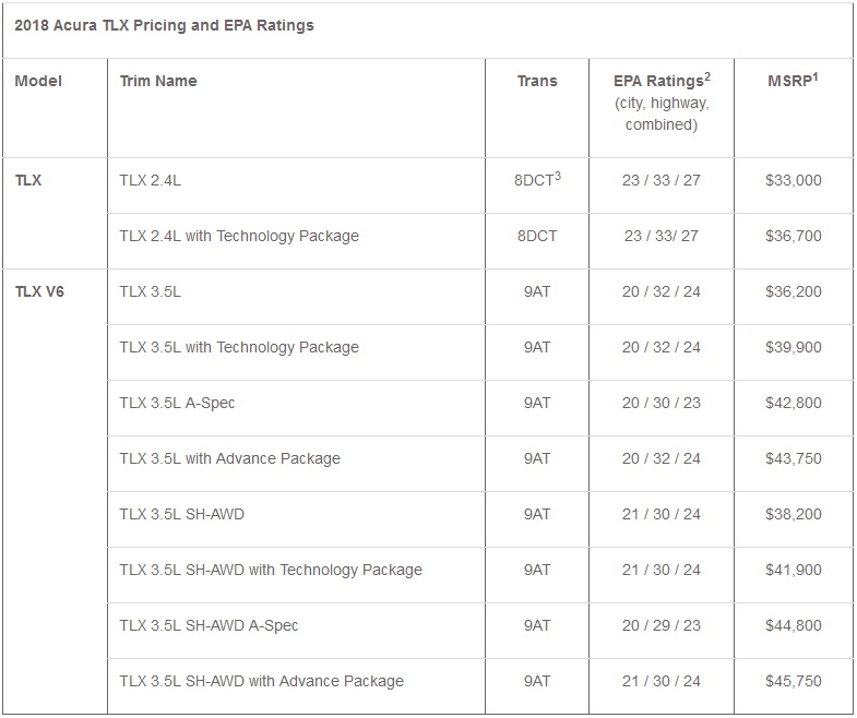 For 2018, Acura is offering the TLX with AcuraWatch as standard across all grades, as prices will start from $33,000 for the new TLX 2.4L, whereas V6-equipped versions cost upwards of $36,200.