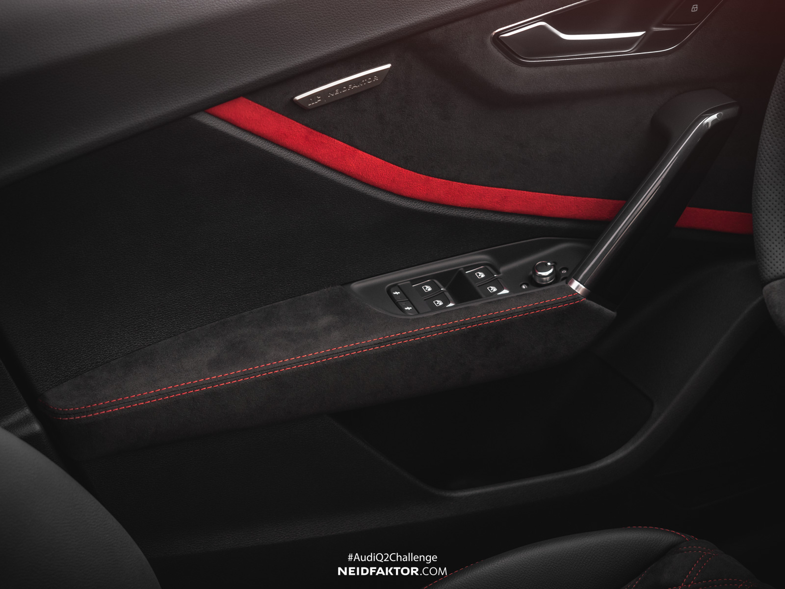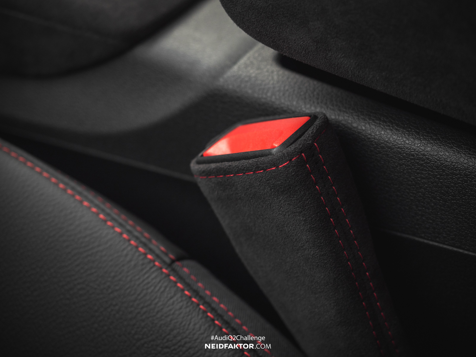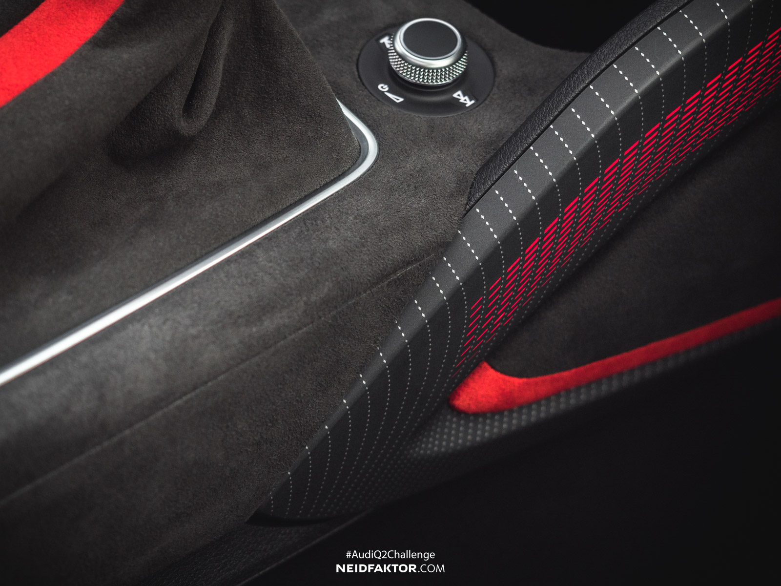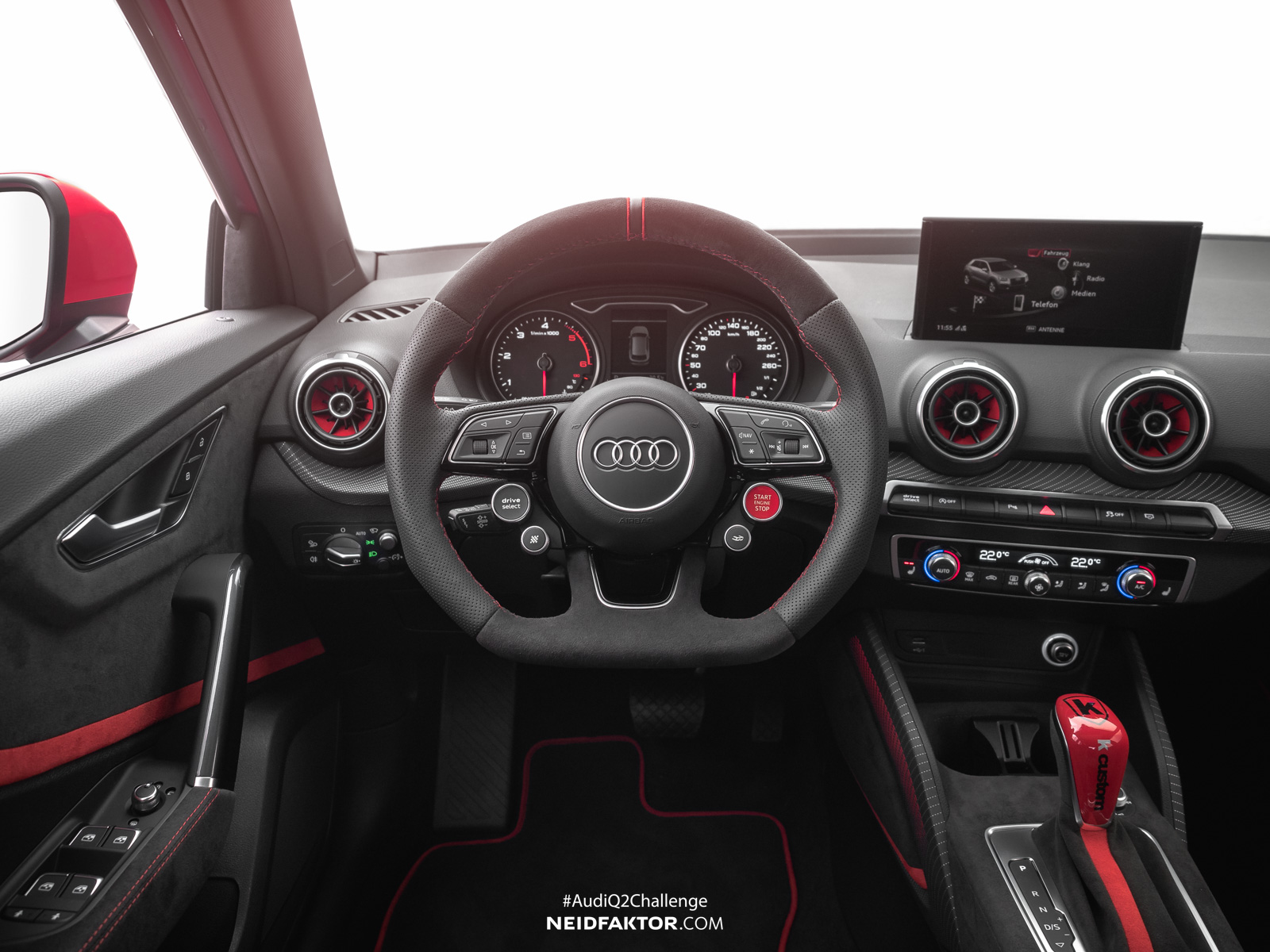 Despite this, German interior specialists Neidfaktor thought it could do better and in our opinion, have knocked it out of the park with this customized Q2. Certainly the most significant interior change enjoyed by this Q2 is the fitment of a flat-bottomed steering wheel almost identical to that of the second-generation Audi R8. It has all of the same buttons, including the bright red Start/Stop button, and also includes a red and black stripe in the center.