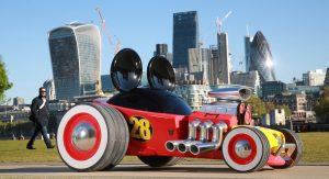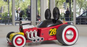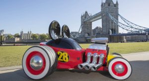 Built to scale in real life, Mickey’s Roadster Racer stretches nearly eight feet long (shorter than a Smart Fortwo) and took more than three months to complete. The life-size mockup features what looks like a V6 up front driving a rather fat set of wheels at the back, with a pair of Mickey ears perched atop the canopy roof (looking rather un-aerodynamic), and the number 28 in reference to the year in which everyone’s favorite cartoon mouse made his big debut in the breakout animated short Steamboat Willie nearly 90 years ago.